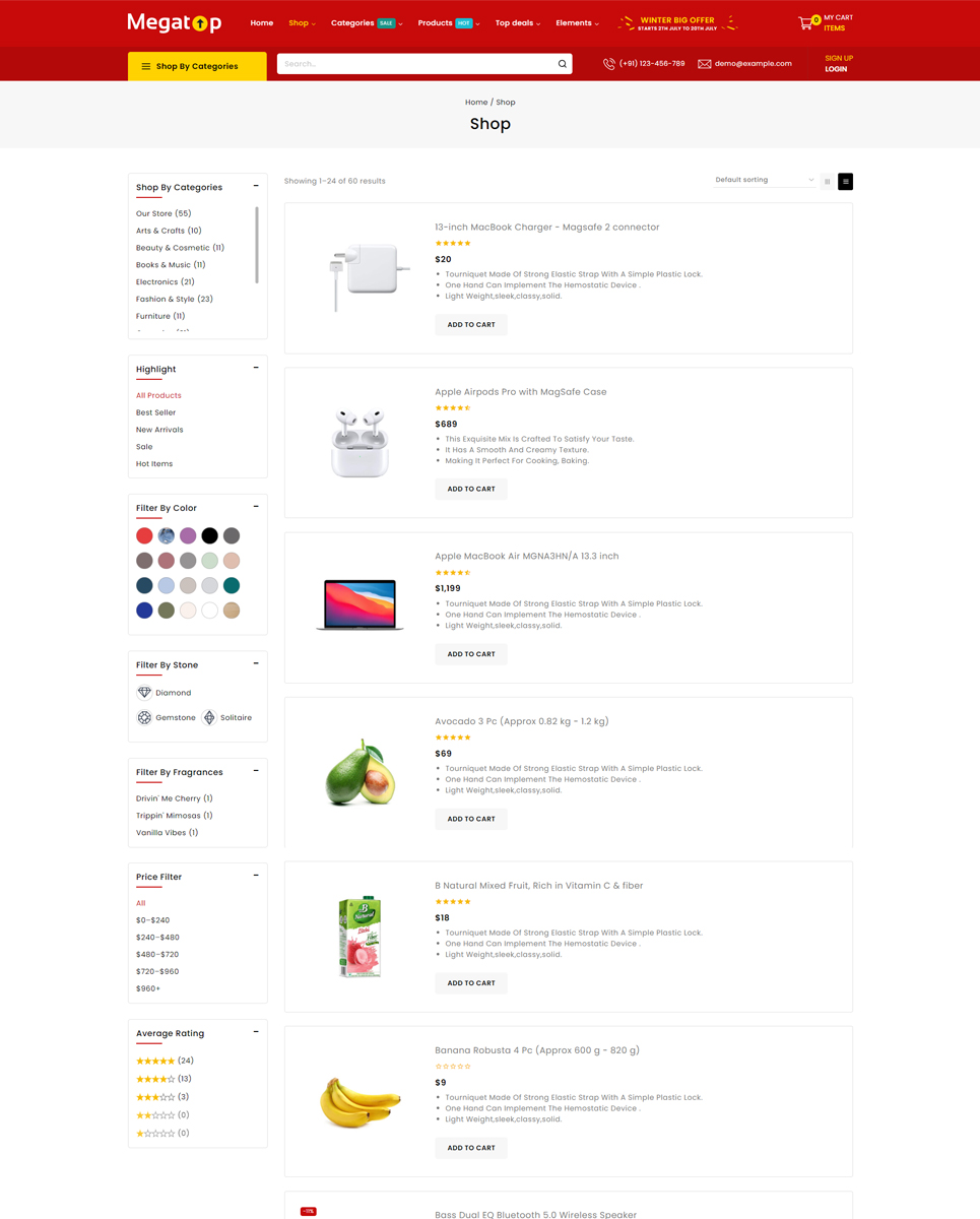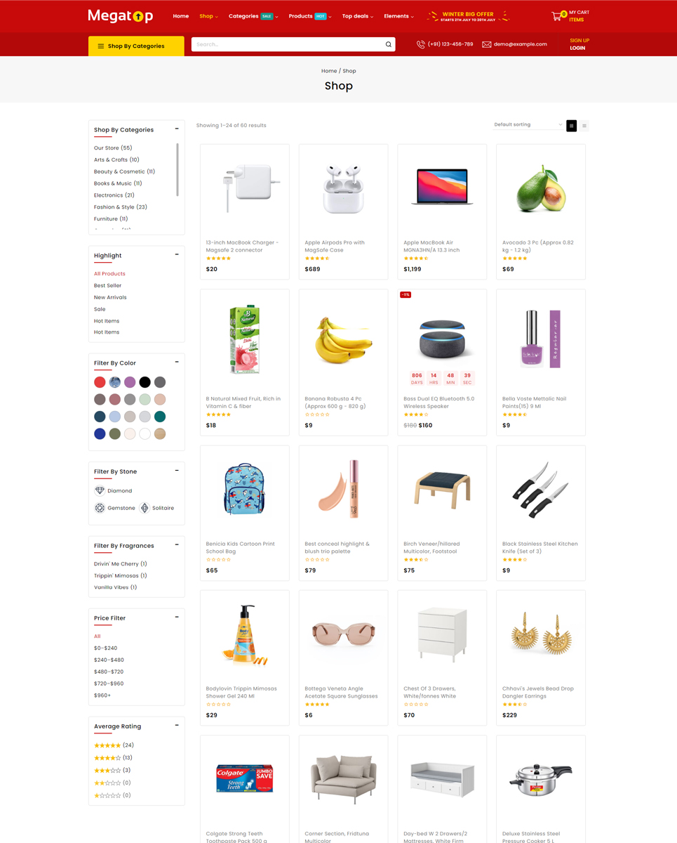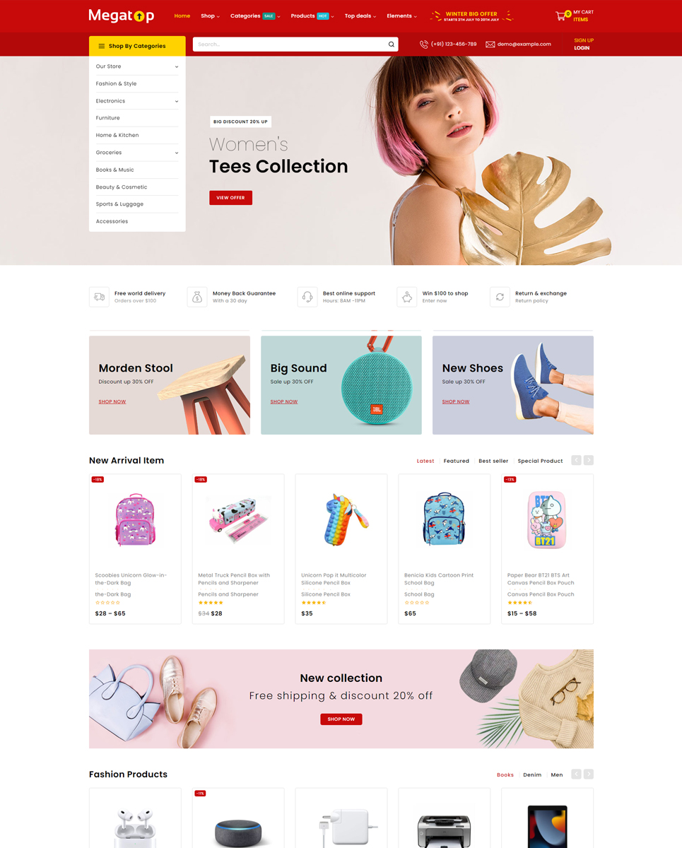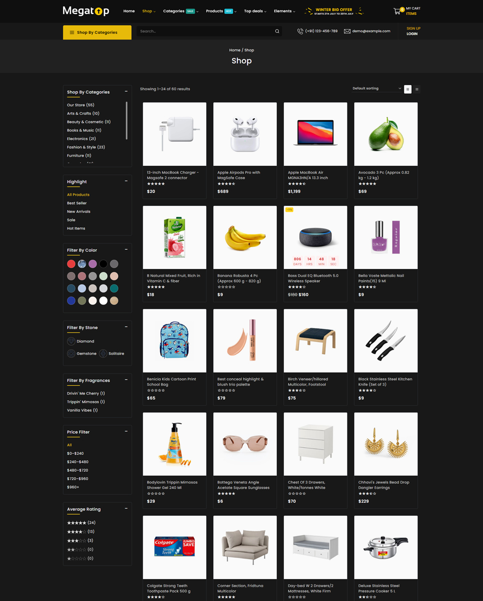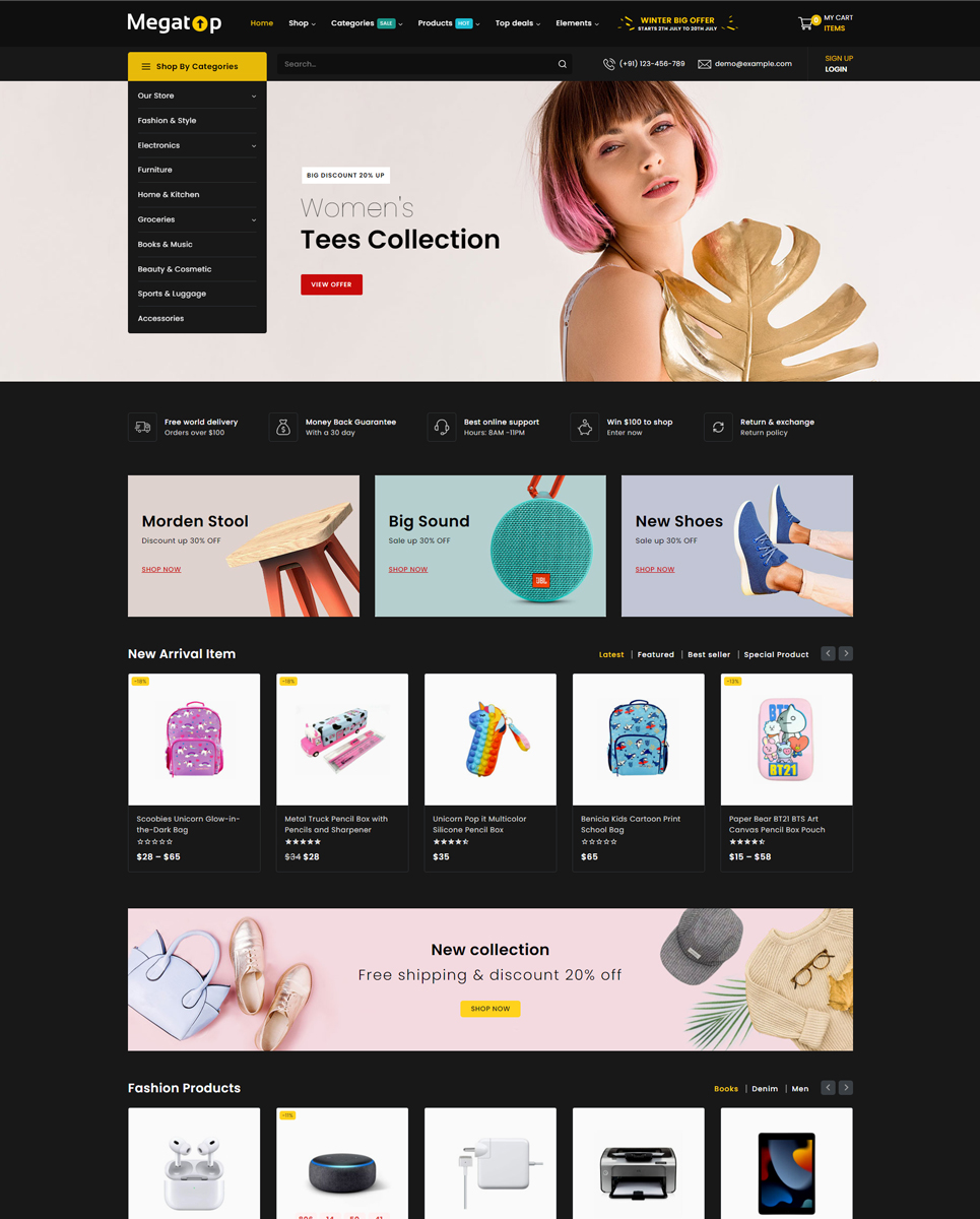 Megatop features a sleek, contemporary look with bold layouts and eye-catching visuals that make your products shine. Its clean, responsive design ensures your store looks stunning on desktops, tablets, and mobile devices alike — giving customers a smooth, enjoyable browsing experience.