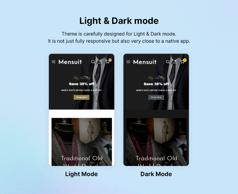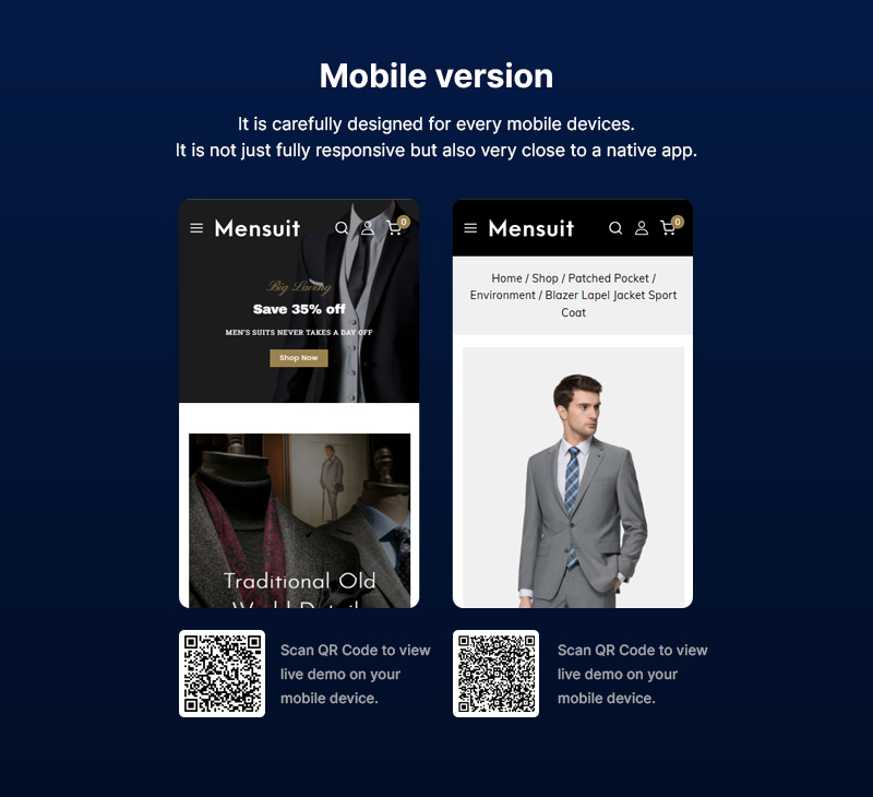 Whether you're selling men's fashion, men's underwear, or creating an elegant store for wedding dresses, MenSuit provides a flexible framework. The theme is perfect for stores in diverse niches, including fashion boutiques, formal wear, and more, offering versatility that meets the demands of various markets.