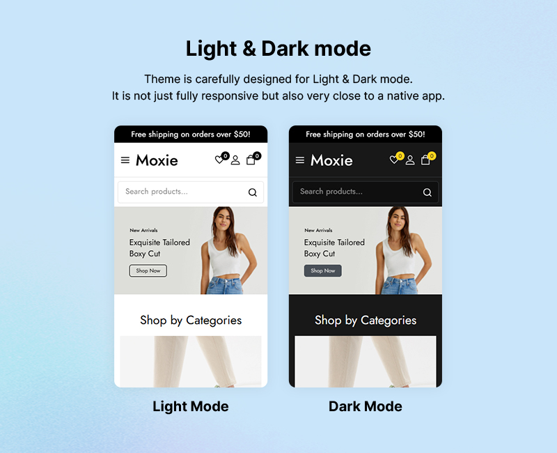 Moxie features a sleek, modern design that exudes sophistication and style. Its clean lines and elegant layouts ensure your products take center stage. With multiple pre-designed homepage layouts, you can choose the one that best reflects your brand’s personality. The theme's fully responsive design guarantees a flawless browsing experience on any device, from desktops to smartphones.
