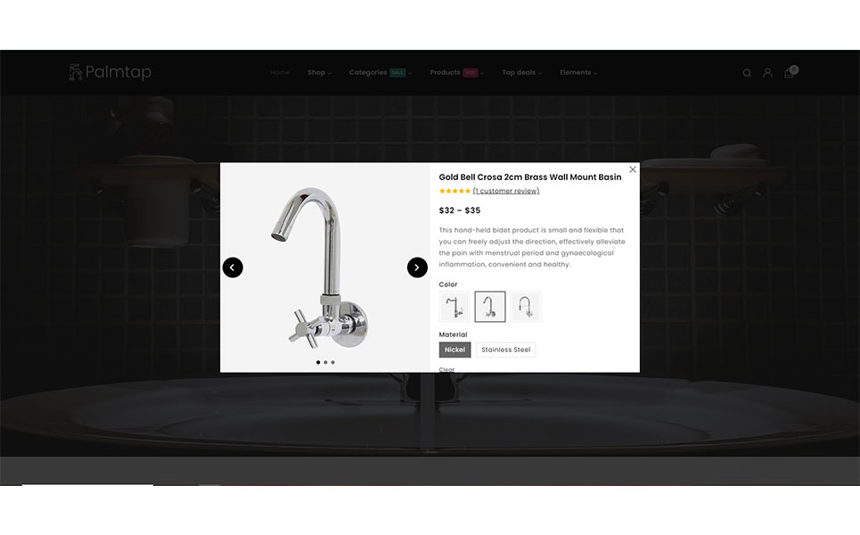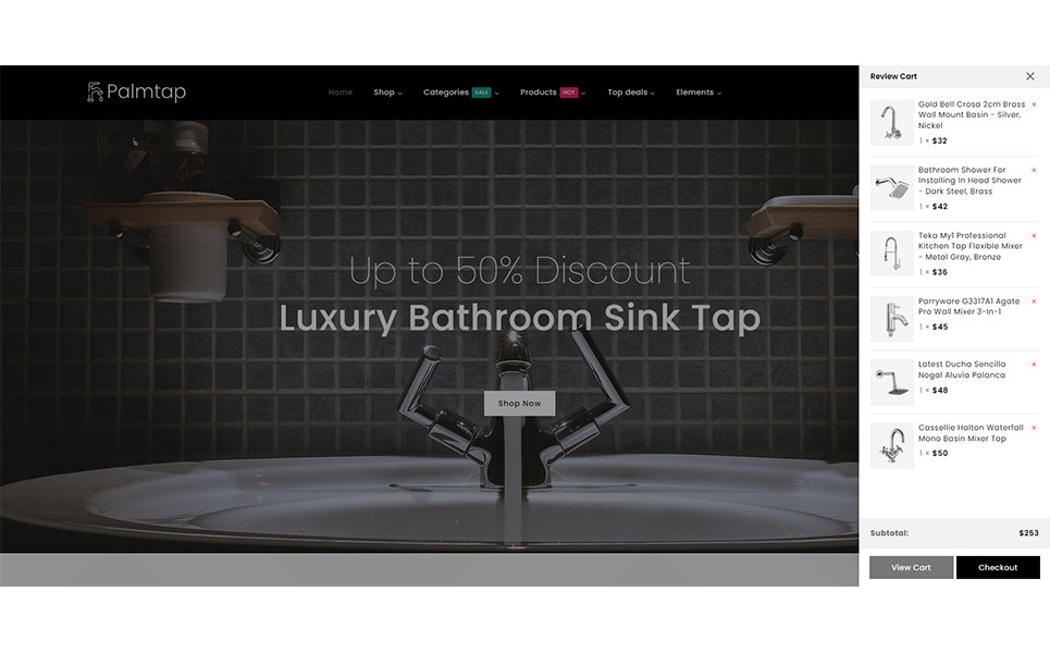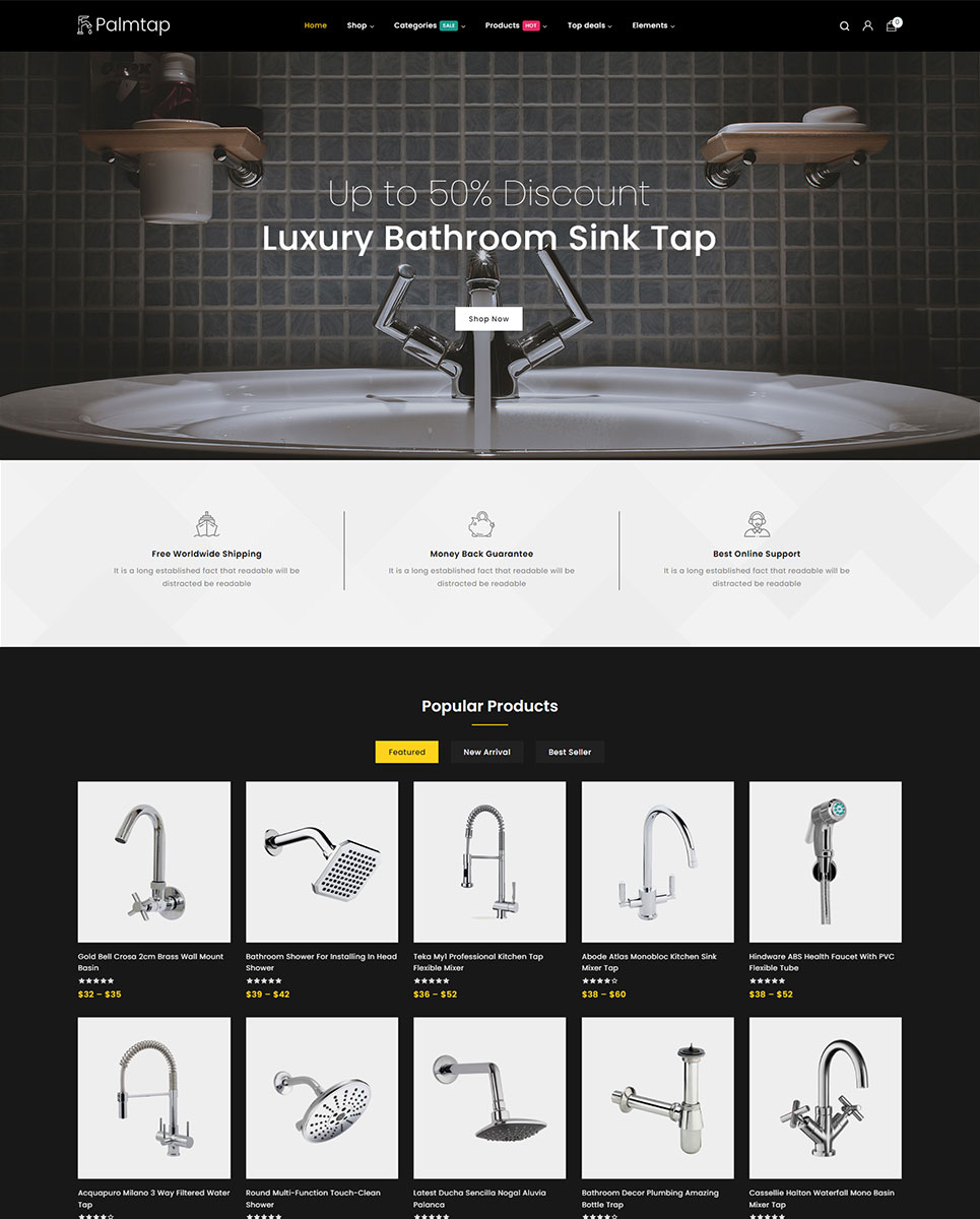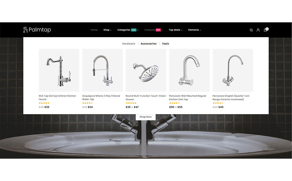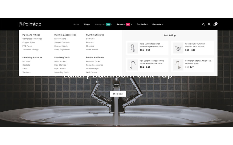 Introducing Palmtap – a sophisticated and versatile WordPress theme tailored specifically for plumbing hardware stores, seamlessly integrating the powerful features of Elementor and WooCommerce. With its sleek design and user-friendly interface, Palmtap offers a dynamic platform for showcasing plumbing hardware products. The theme boasts a sleek and modern design aesthetic that perfectly complements plumbing hardware products. With clean lines, crisp typography, and visually appealing imagery, Palmtap exudes professionalism and sophistication.