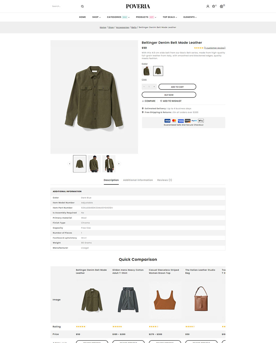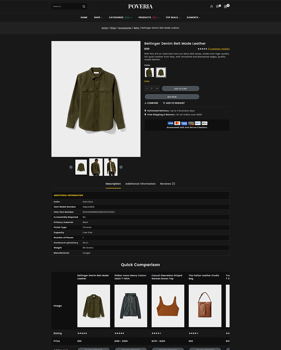 Poveria boasts a sleek, contemporary design with clean layouts, bold typography, and eye-catching imagery — putting your products in the spotlight. Its fully responsive structure ensures your store looks flawless on all devices, from desktops to smartphones. Whether your customers are browsing a new collection or searching for a wardrobe refresh, Poveria delivers a seamless, visually appealing shopping experience.