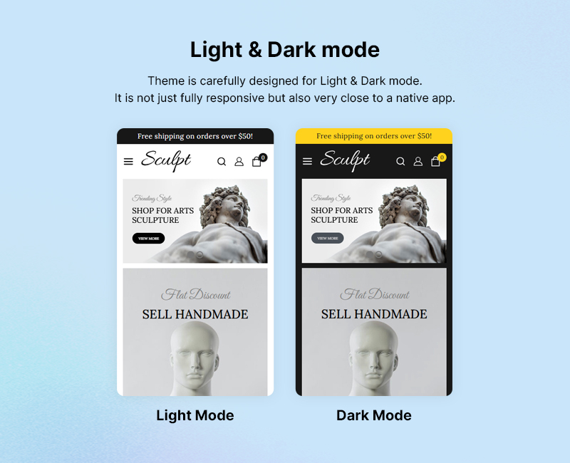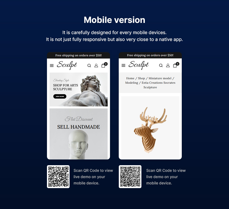 With its refined design, high-end functionality, and effortless customization, Sculpt is the ideal solution for building a captivating art gallery, museum, or sculpture store. Whether you're an artist, curator, or gallery owner, this theme helps you present art in its best form. Get Sculpt today and bring your art to life online!