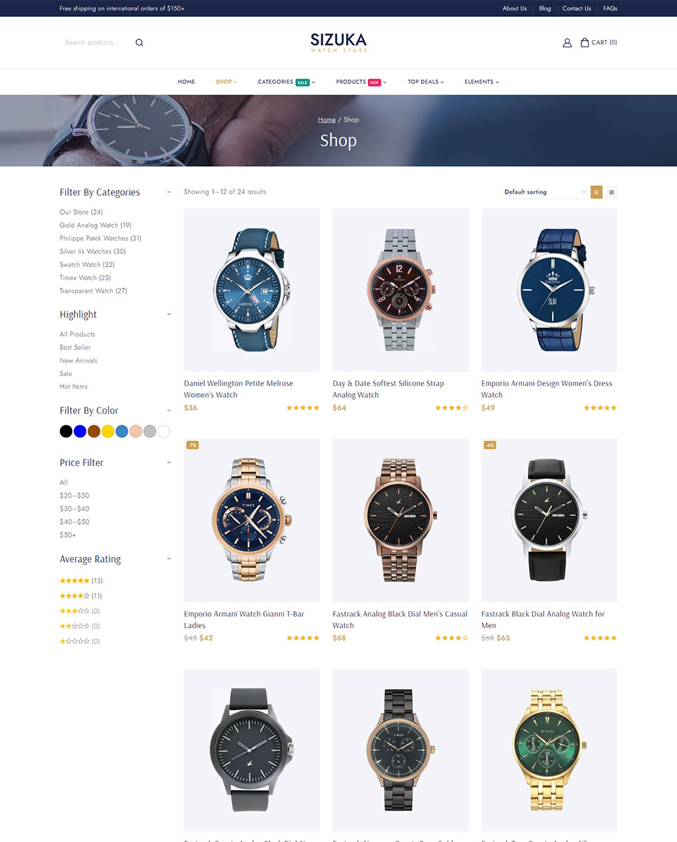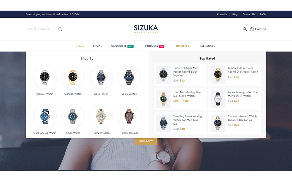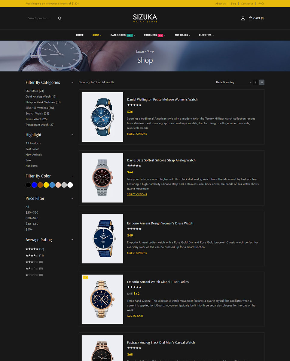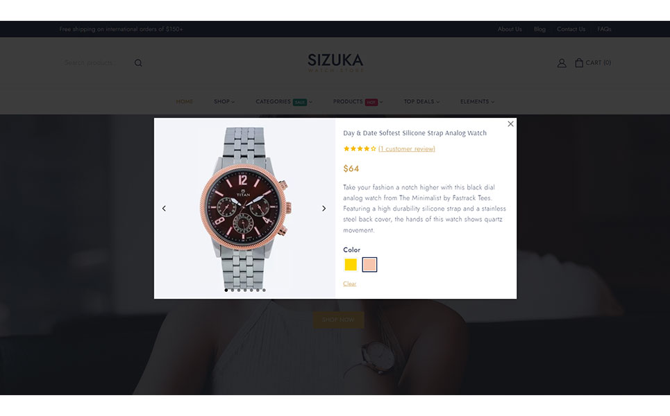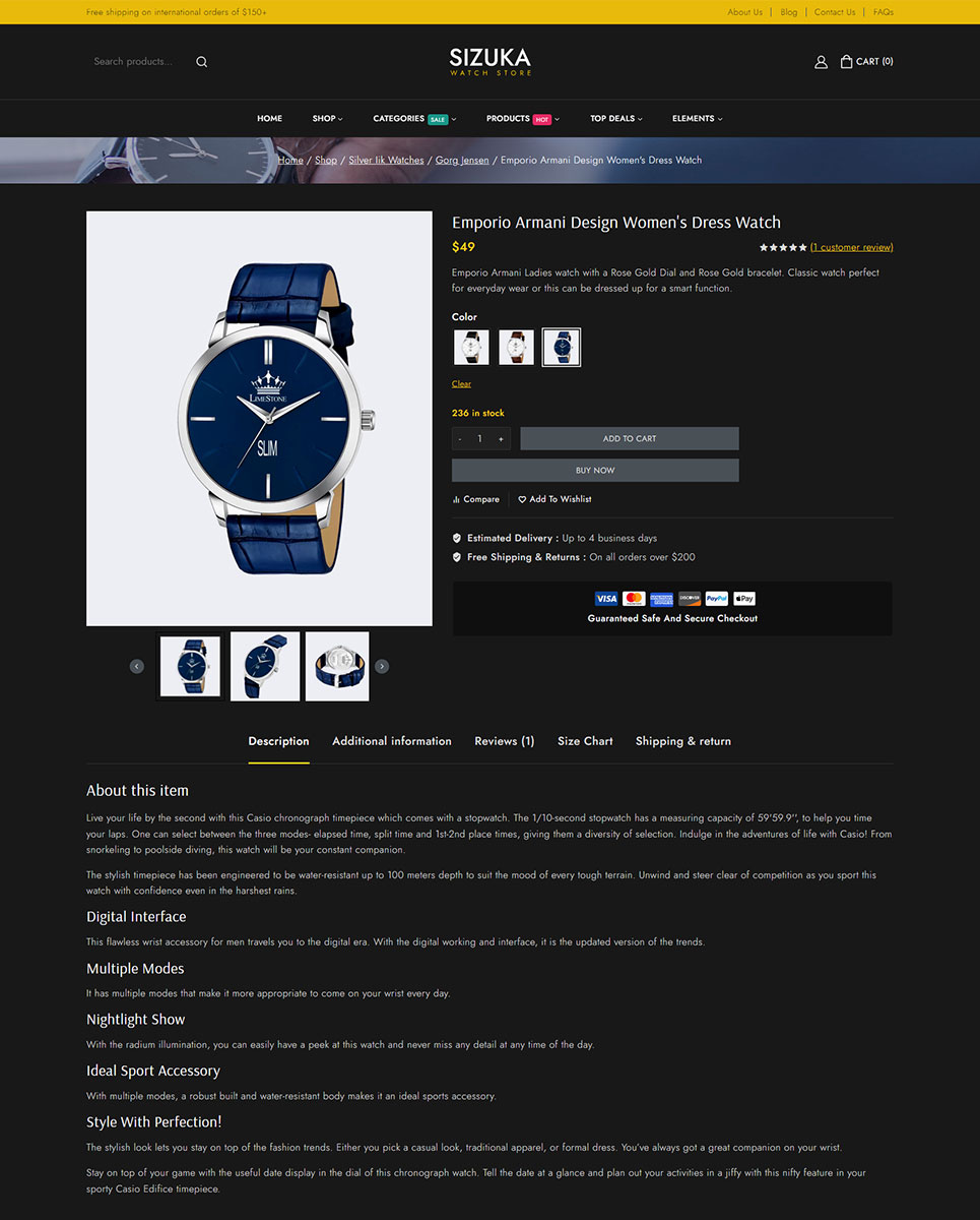 Sizuka Luxurious Watch Store is a high-quality WooCommerce theme with a mobile-friendly design that is ideal for online retailers for creating ecommerce website for their business like Watch Store, Jewelry Store, Gift Shop, Bag Store, Other Accessories and Fashion-related items. Sizuka isn't just a theme; it's an exquisite showcase of luxury and elegance, meticulously designed to elevate your online watch store to unparalleled heights.