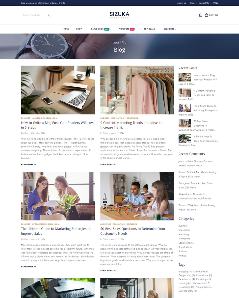 Thanks to WooCommerce integration, managing your inventory and processing transactions is a breeze, allowing you to focus on what you do best – curating an impeccable collection of luxurious timepieces. The theme has all of the necessary elements for running a successful online watch store, such as Ajax Wishlist & Compare, Product Quickview, Ajax Cart, Mobile Navigation, Newsletter & Blog section. Sizuka's Mega Menu feature, enabling you to organize your watches into intuitive categories and subcategories, ensuring that your customers can find their perfect timepiece with ease.