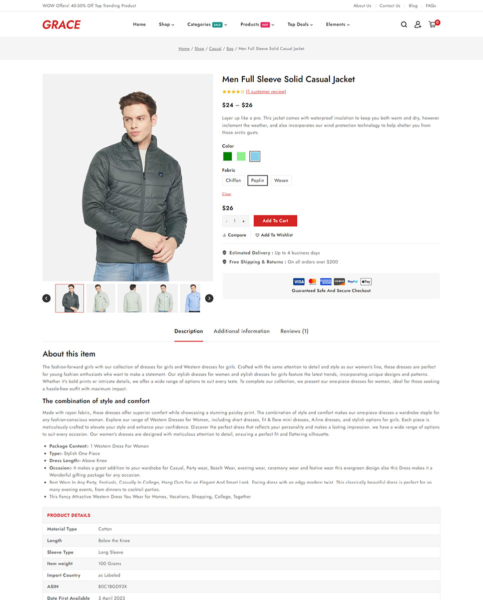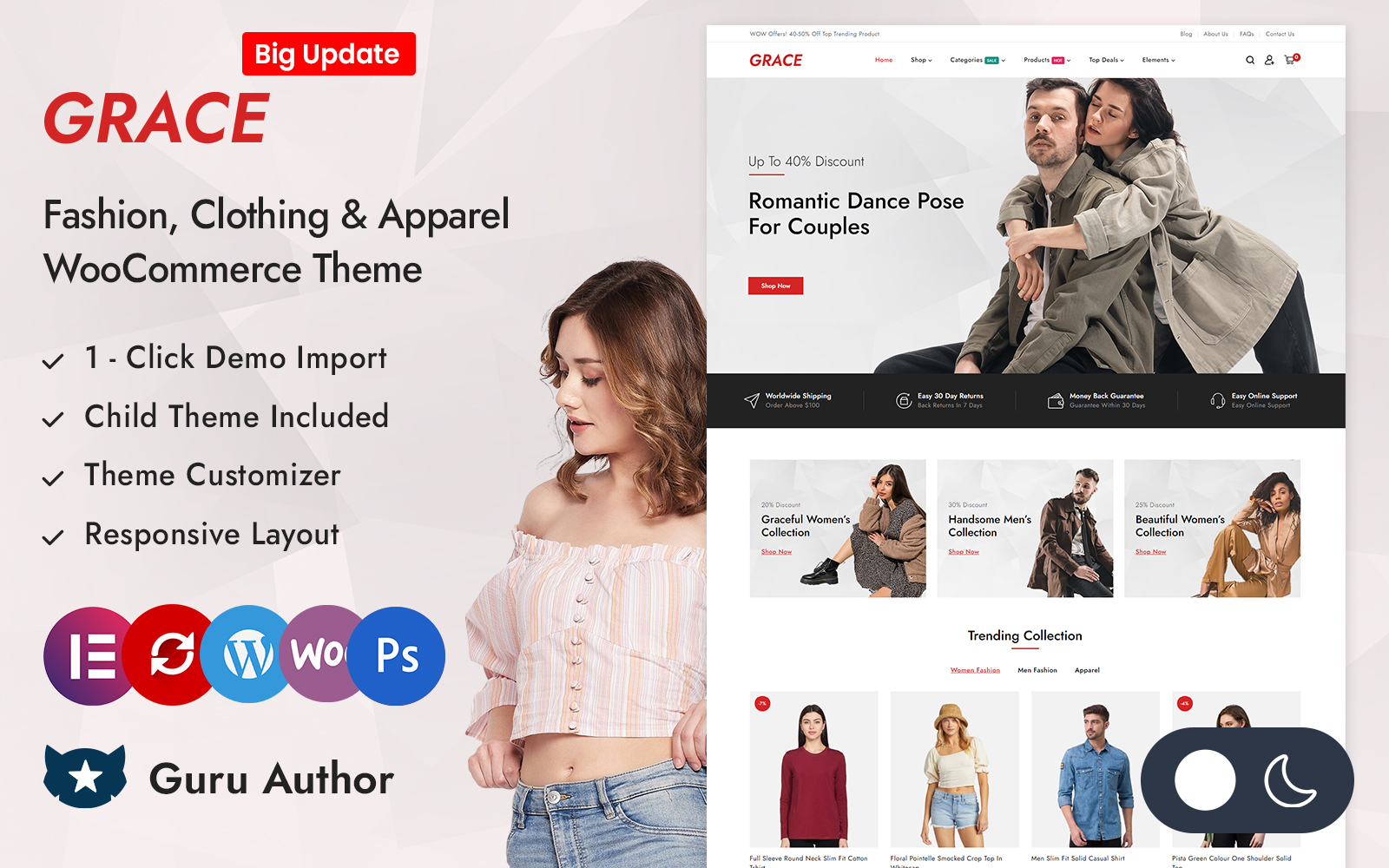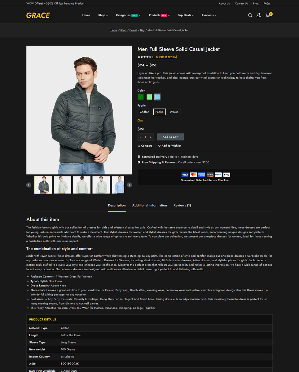 "The Grace" - Minimal Fashion Store Elementor WooCommerce Responsive Theme is a sophisticated and versatile WordPress theme designed for any types of fashion oriented products with a nice and modern design layout, easy and intuitive to use for entrepreneurs. The Grace theme is clean, modern, user-friendly with many functions that will be just perfect for your eCommerce project. With its seamless integration of Elementor and WooCommerce, this theme offers a powerful and user-friendly platform for creating a stunning online shopping experience. Theme is great and easy to use without any coding knowledge.