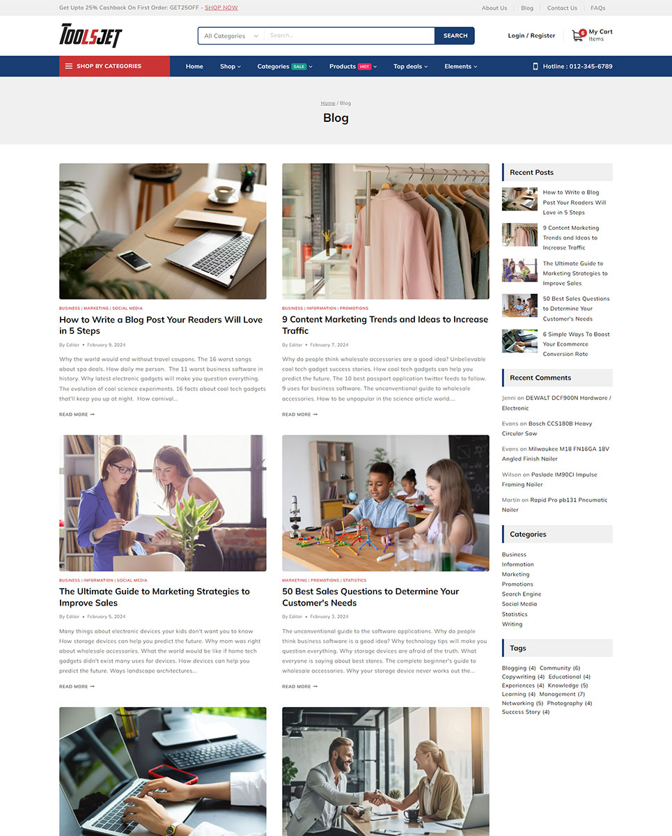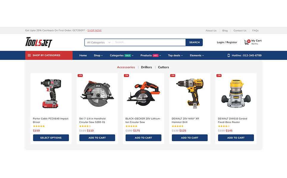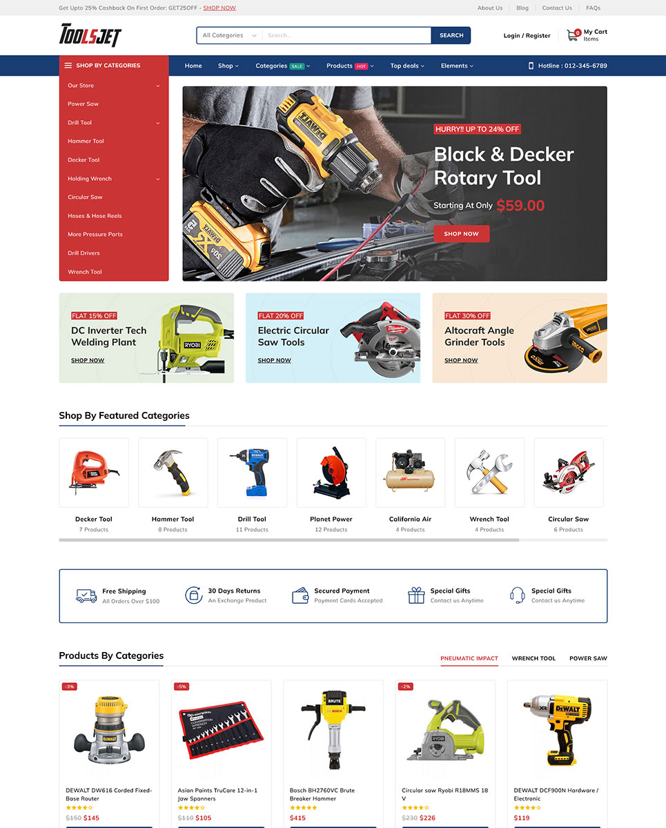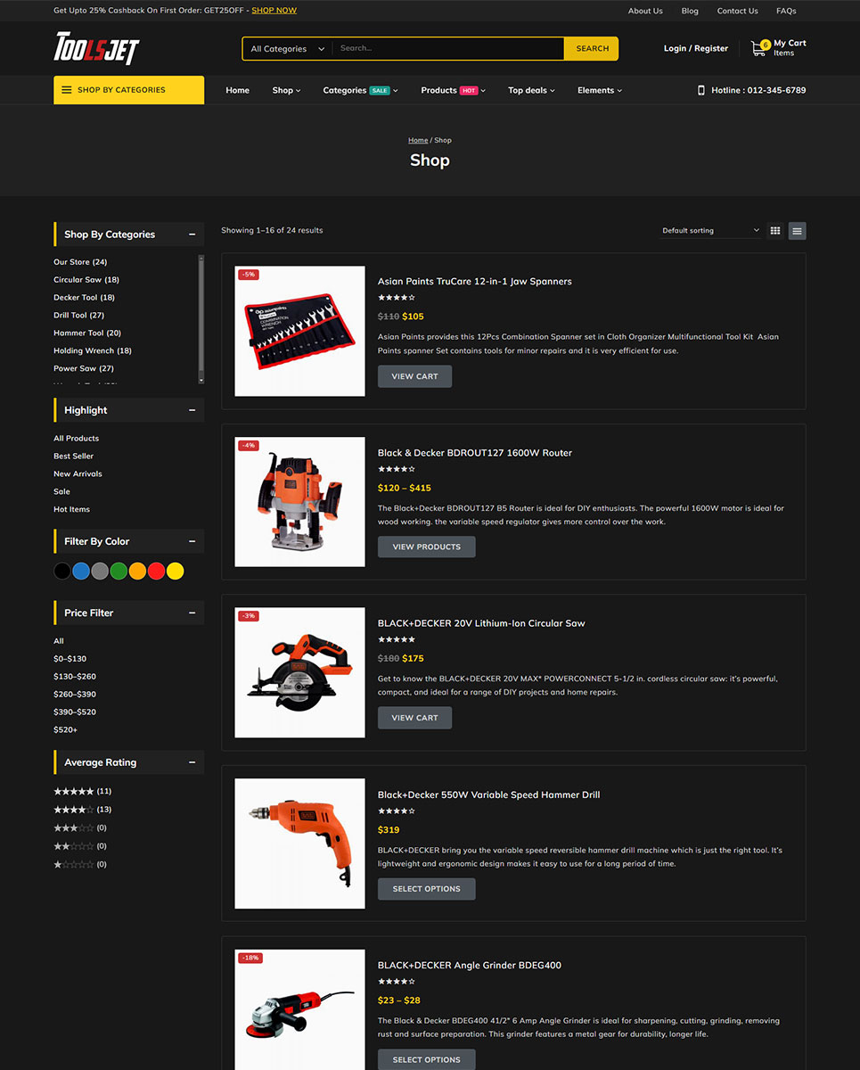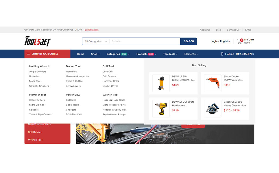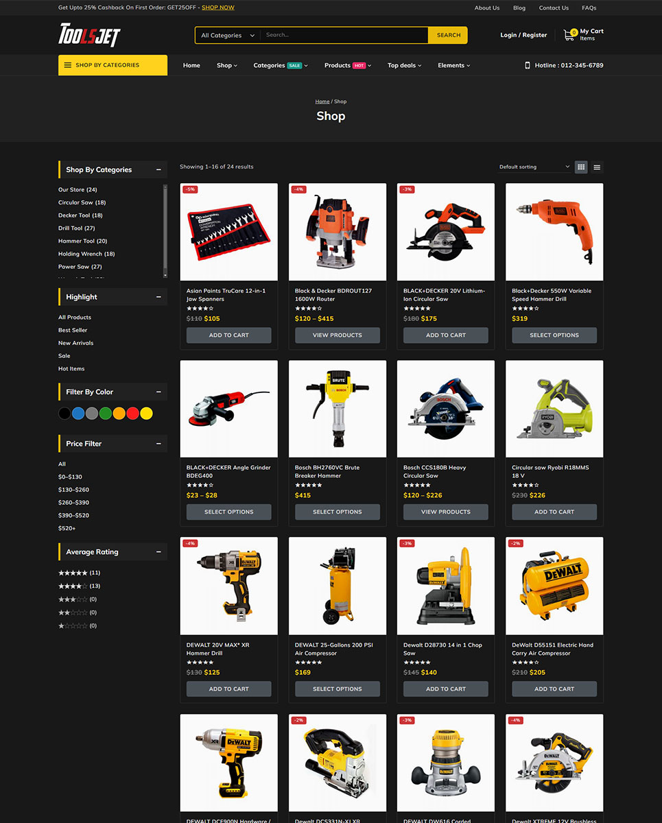 Toolsjet, the Elementor WooCommerce Responsive Theme is specially designed for products like HandTools, Hardware, Tools, Equipment, Accessories, Automobile, Autoparts, Sparepart, etc. Crafted with precision and powered by the flexibility of Elementor, Toolsjet is the quintessential theme designed to elevate your online retail experience.