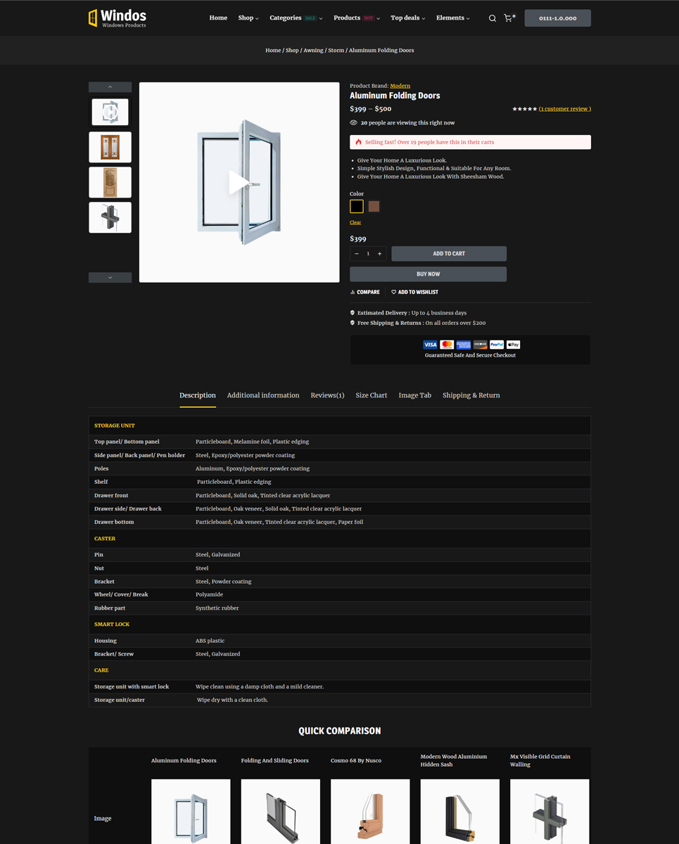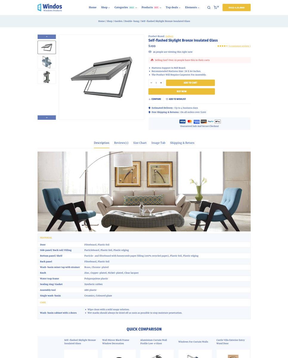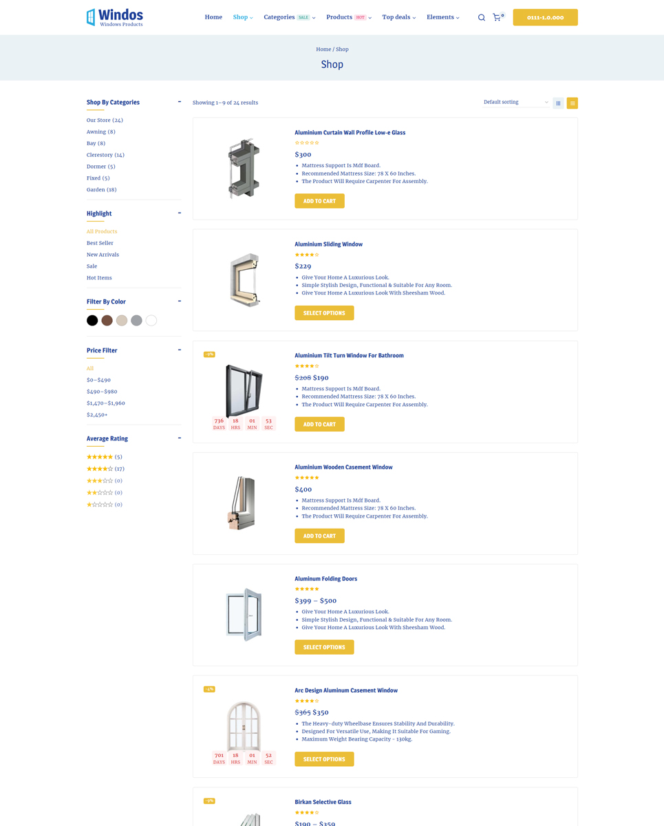 Windos is packed with essential eCommerce features to enhance the shopping experience. AJAX-powered product filters allow customers to sort by price, style, or material without page reloads, keeping things fast and smooth. The quick view function lets users see product details in a convenient popup, while wishlist and compare options keep them engaged by saving favorites and comparing products side by side. The built-in mega menu supports easy navigation, making it effortless for shoppers to find exactly what they need — whether that’s modern glass panels, sturdy exterior doors, or decorative windows.