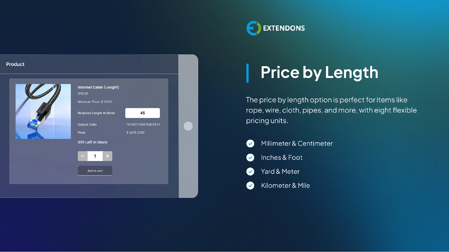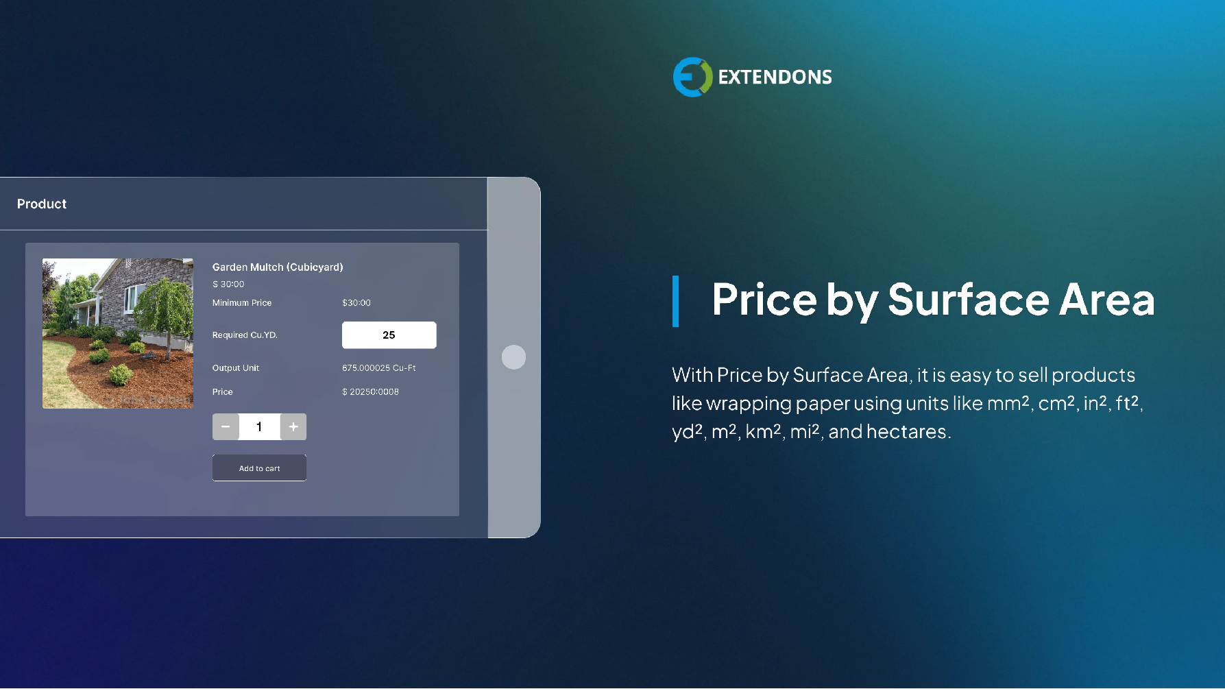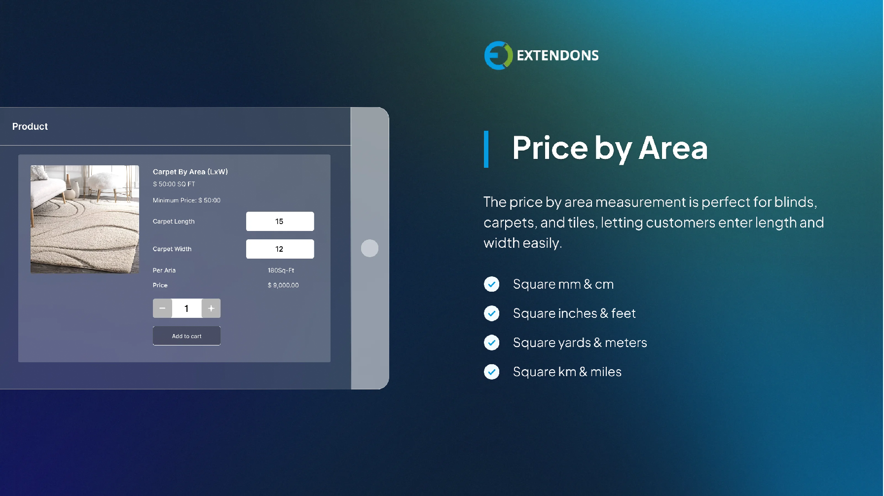 The WooCommerce Measurement Price Calculator by Extendons includes 9 measurement types to fit your store’s needs. You can sell by length, weight, surface area, box, volume, or other measurements.