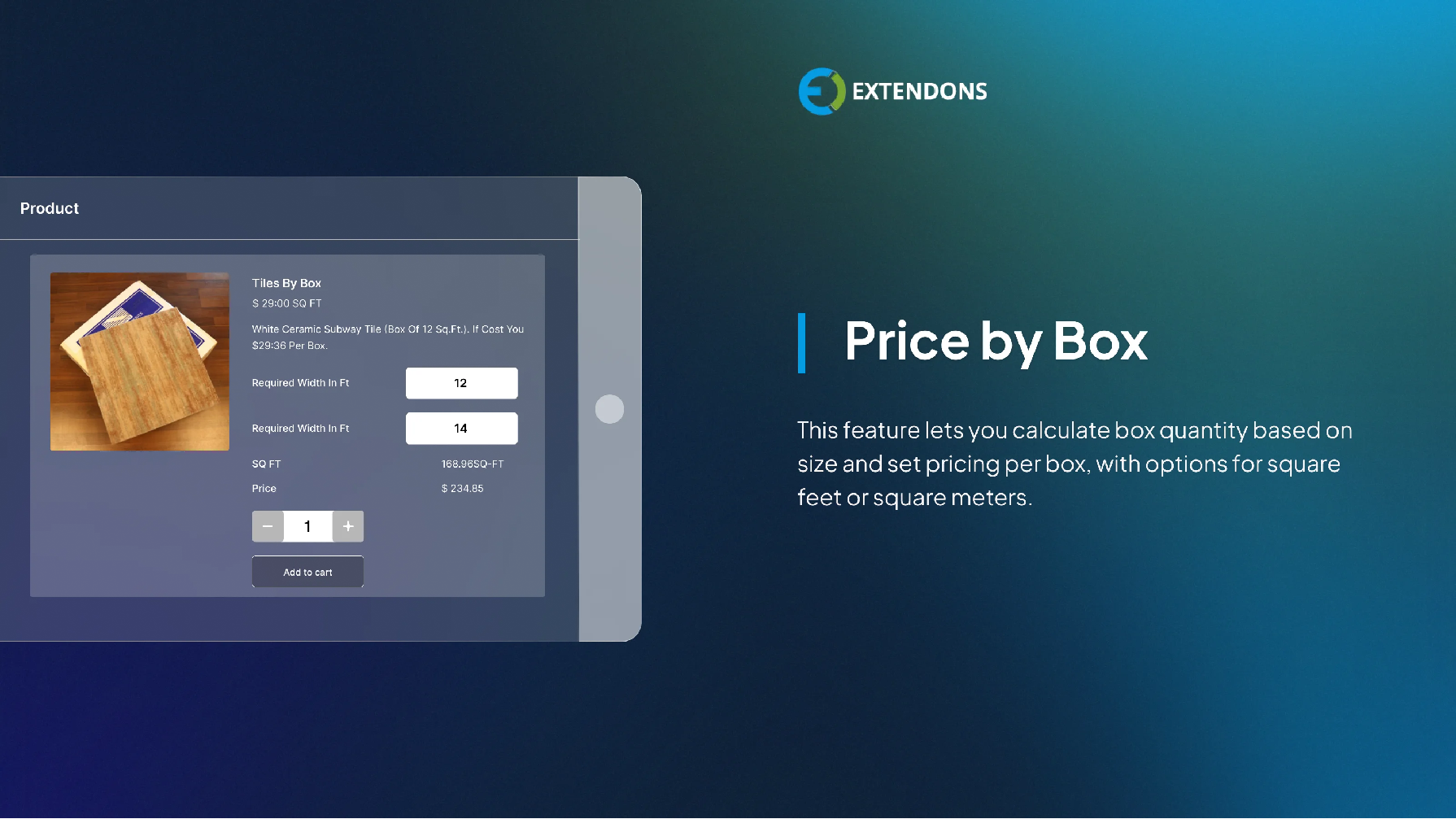 Lets you calculate pricing based on how many boxes are required instead of size alone. Works well for flooring or tiles where you can set price per box in square feet or meters.