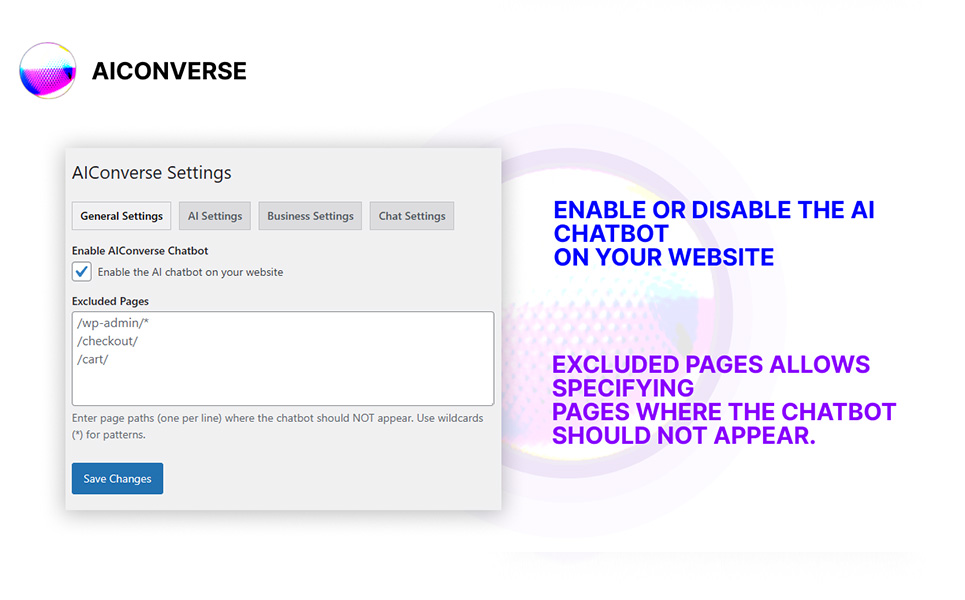 - Page Exclusions: Disable the chatbot on specific pages (e.g., /wp-admin/, /checkout/, /cart/).
