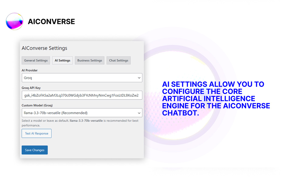 AIConverse is a powerful AI-powered chatbot plugin that enhances your WordPress website with intelligent live chat functionality. Designed for businesses, bloggers, and developers, this plugin leverages advanced AI models like Groq, Google Gemini, and OpenRouter to provide context-aware responses tailored to your needs.