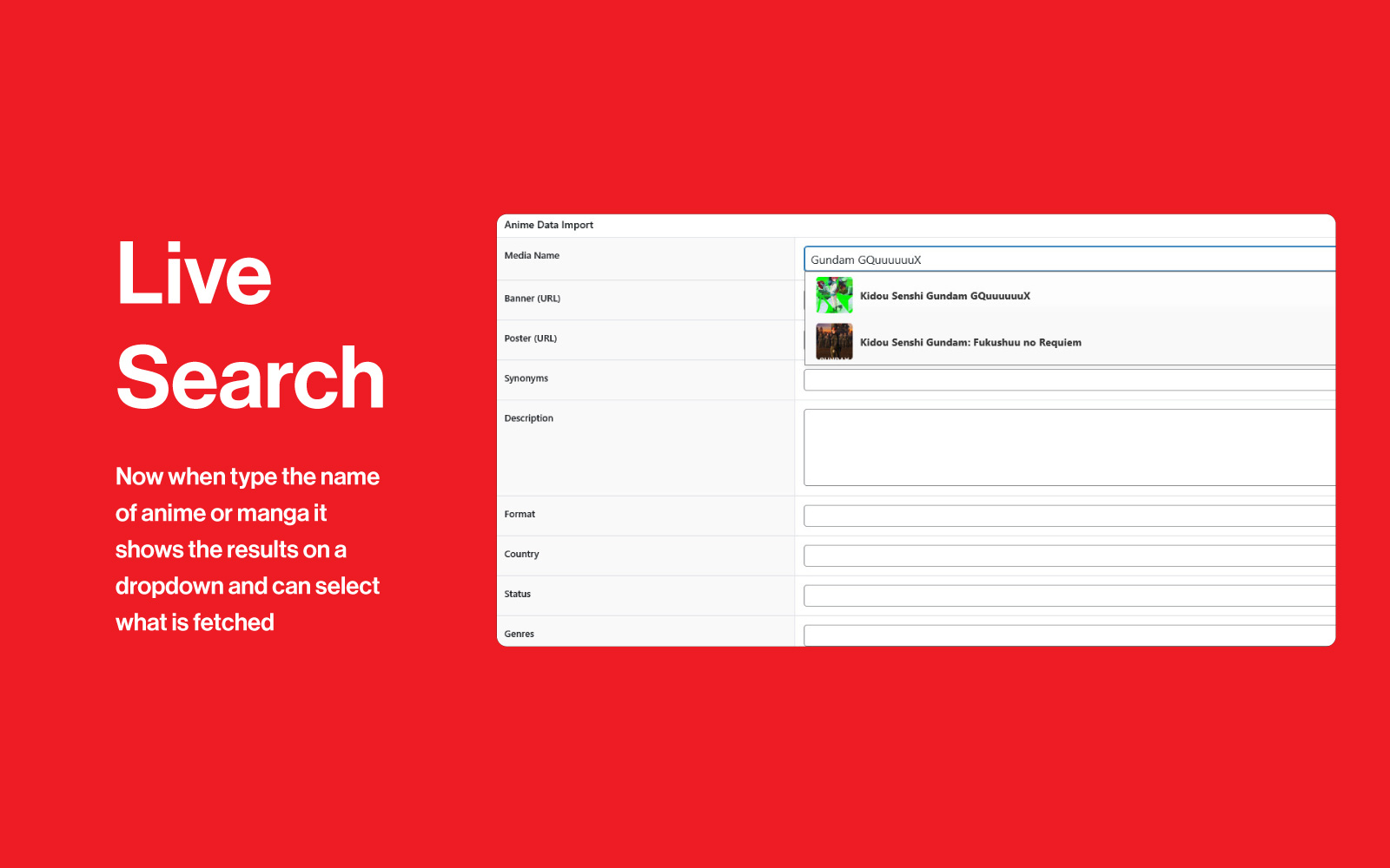 Search for anime and manga data with pinpoint accuracy using names performing a live search. Whether you’re adding a popular series or a niche title, ANIMATA simplifies the search and fill data process.