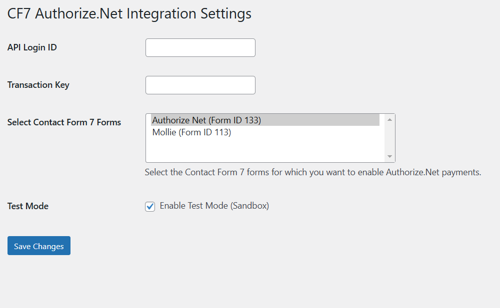 2. Go to settings and navigate to CF7 Authorize Net Settings. Give your Authorize Net API key, Transaction Key and select forms you want to integrate. Enable Test mode if you are in test mode.