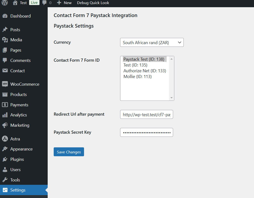 2. Go to settings and navigate to CF7 paystack Settings. Give your paystack secret key and select forms you want to integrate. Select currency and Give redirect url.