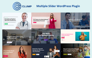 Clump is a slider plugin for WordPress (also available as an HTML template) that helps you create multiple sliders on your website using prebuilt designs. It is marketed as a tool to quickly set up visually appealing, responsive sliders with customization options.