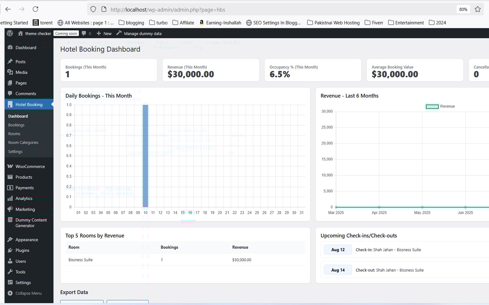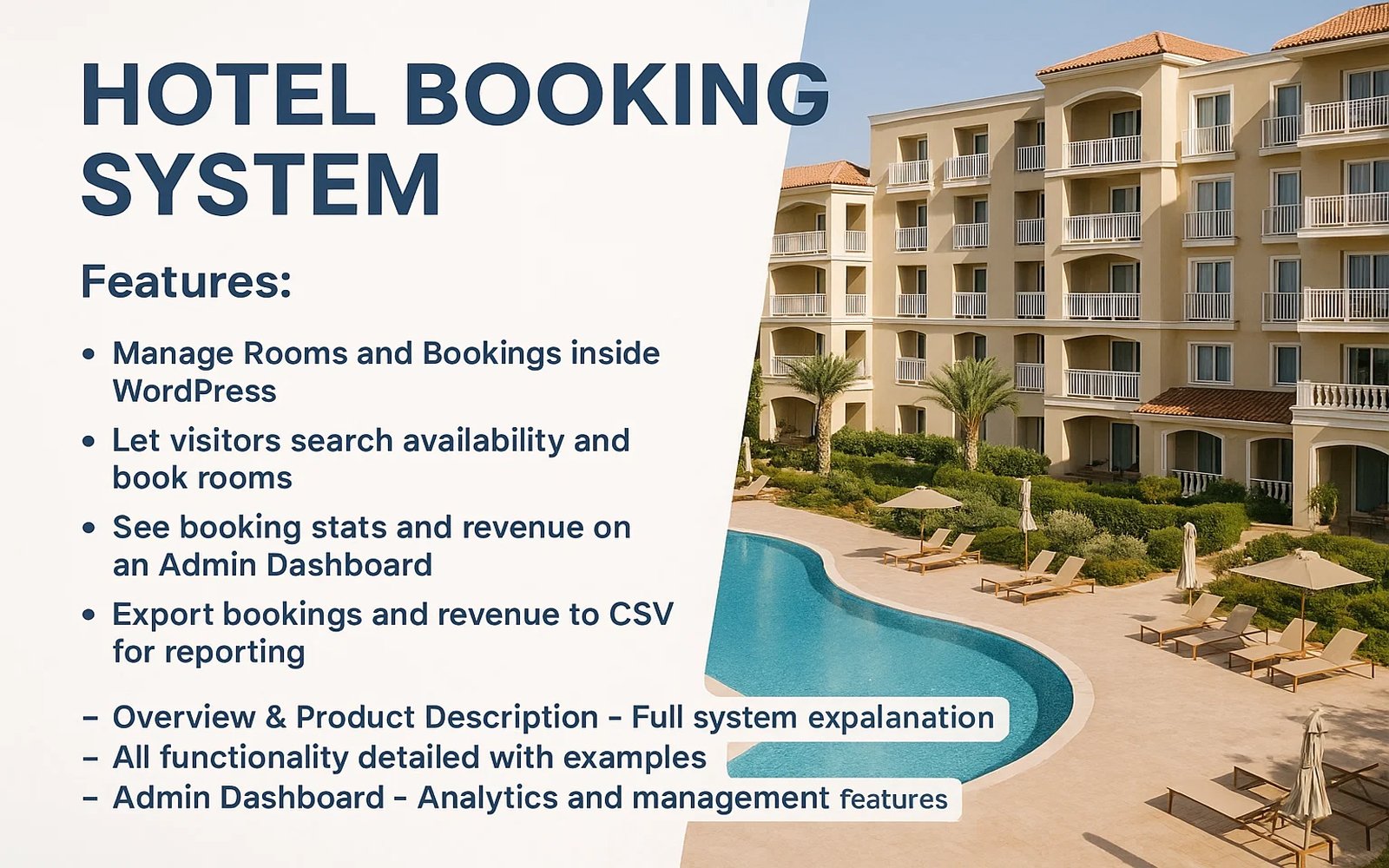 Hotel Booking WordPress Plugin is a complete reservation management solution for hotels, resorts, guest houses, and vacation rentals. It allows you to easily manage rooms, track bookings, and check real-time availability from your WordPress dashboard. Guests can search available dates, book instantly, and receive automated confirmation emails. The admin dashboard provides booking statistics, revenue tracking, and detailed analytics to help you make informed business decisions. You can export booking and revenue data to CSV for reporting and analysis. This plugin is mobile-friendly, fast, and designed to increase online bookings while simplifying hotel management.