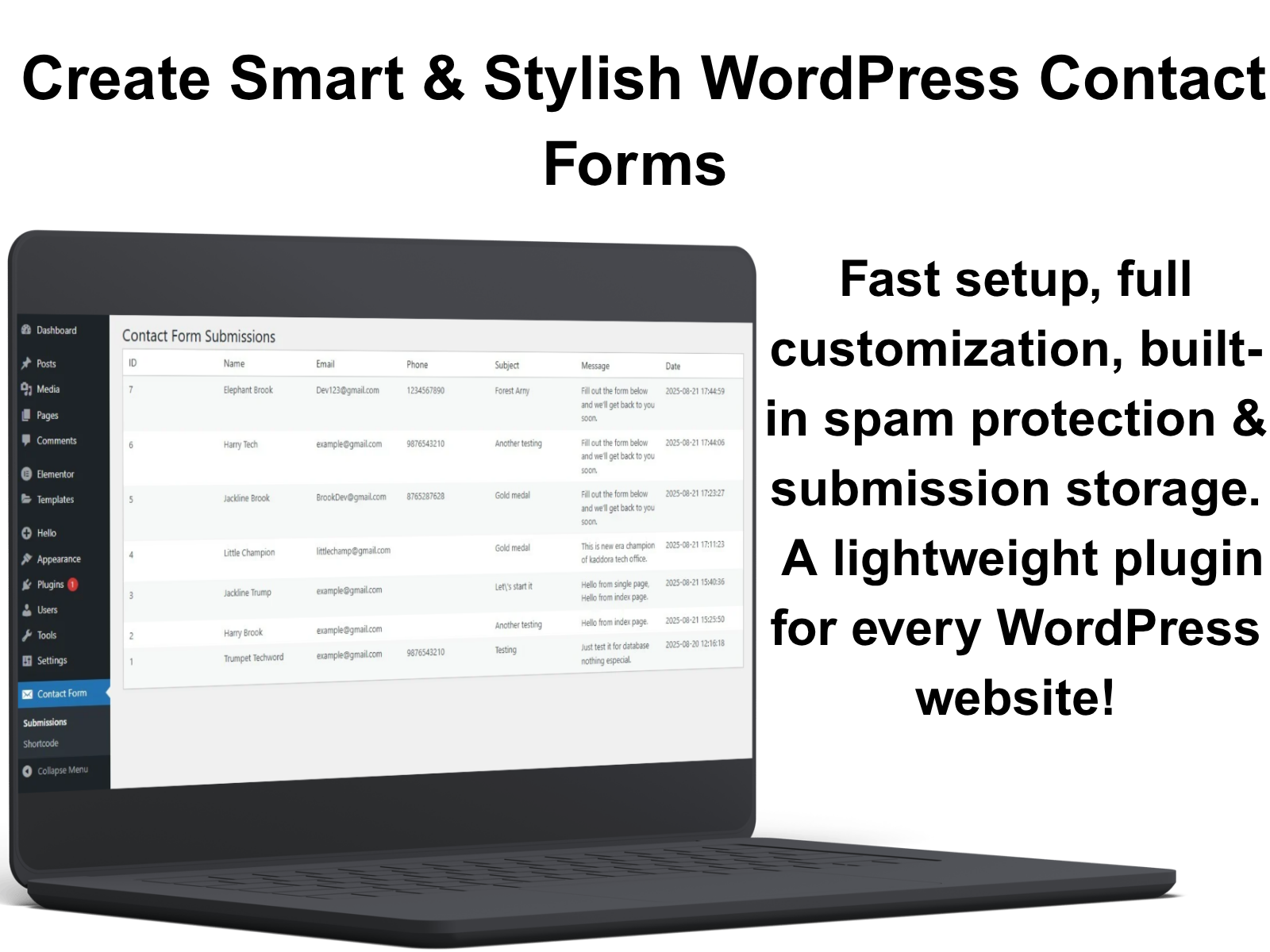 Unlike bulky form plugins, KDR Contact Form is lightweight, fast, and privacy-focused. You get full control over your data — no third-party integrations required. Perfect for businesses that value security, speed, and customization.
