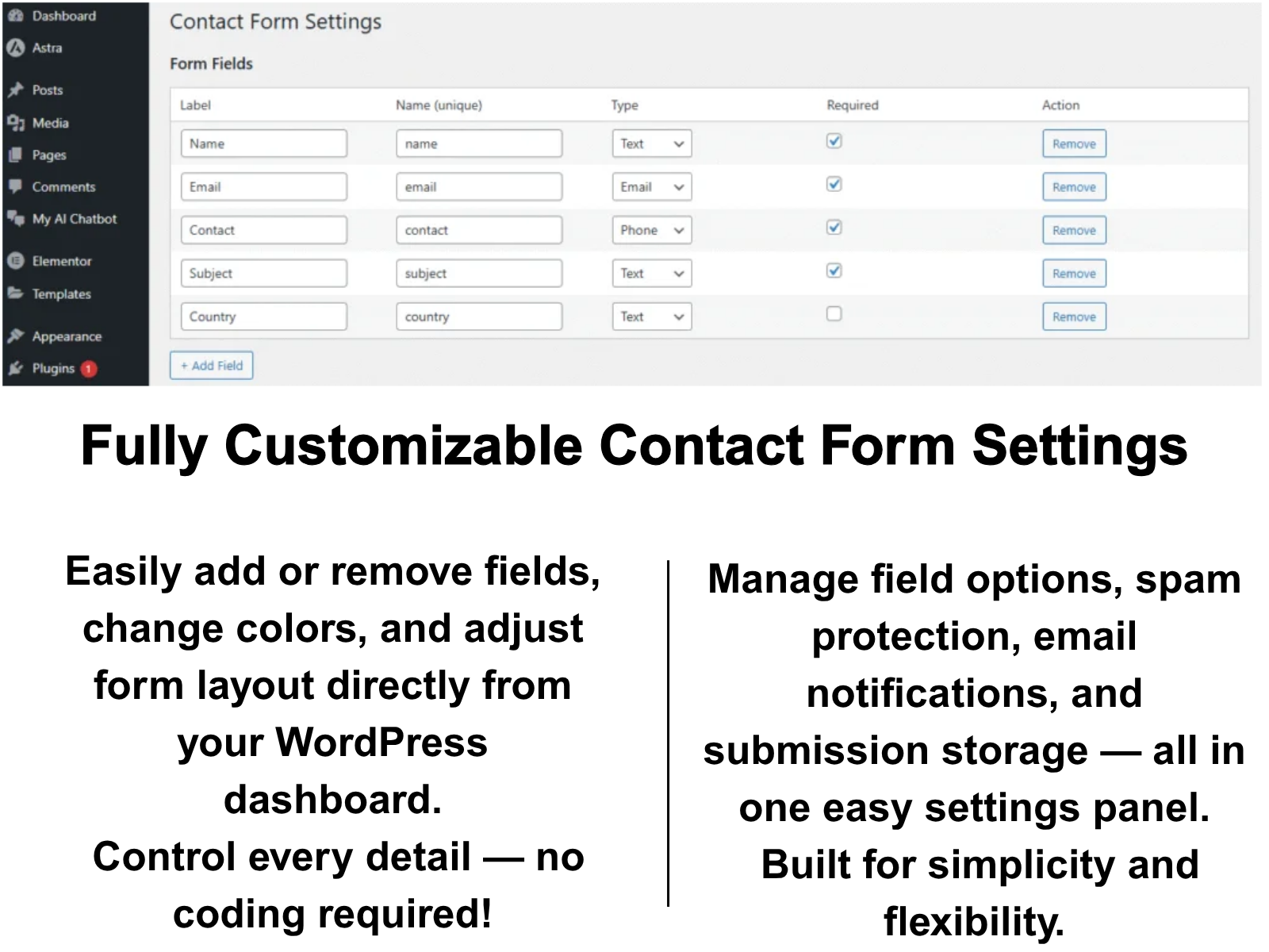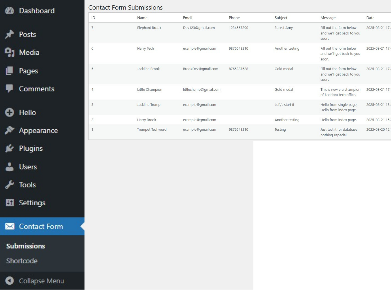 Above all, the plugin was intended to be simple, flexible, and secure. Custom input fields can be added easily, the forms can be styled to suit your theme, and user submissions are collected safely inside your WordPress dashboard. With built-in spam filters and email notifications, you'll never miss a message while keeping the unwanted submissions away.