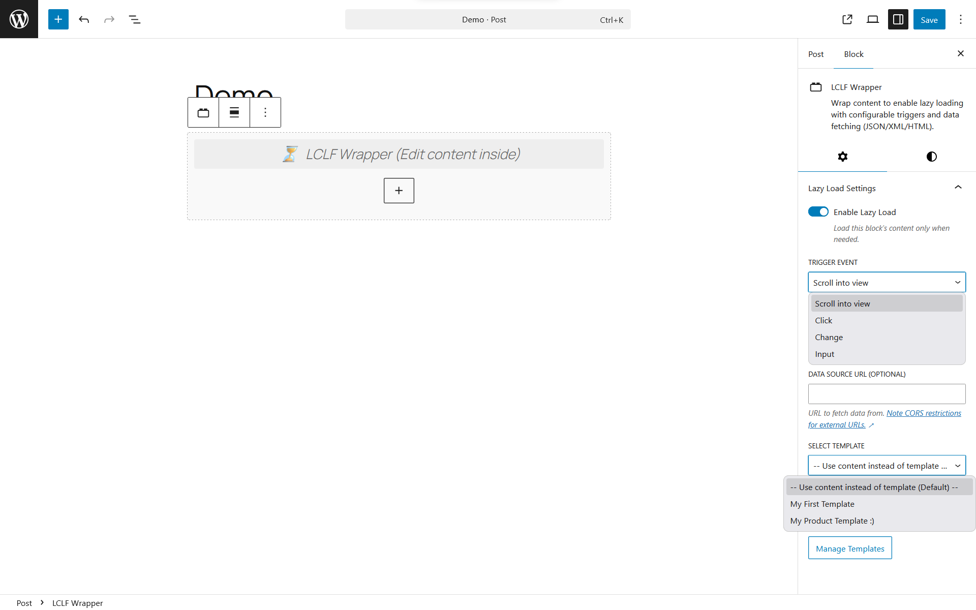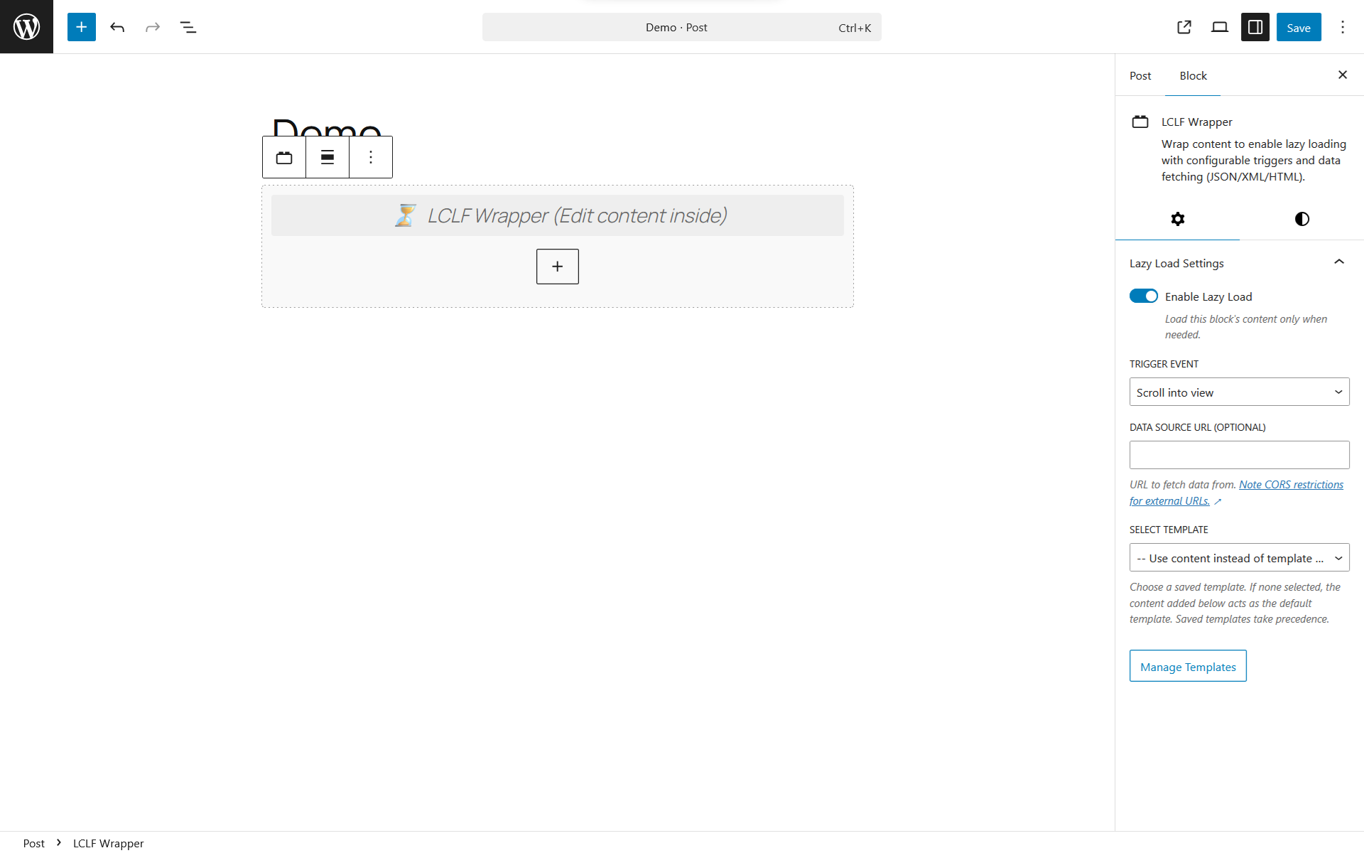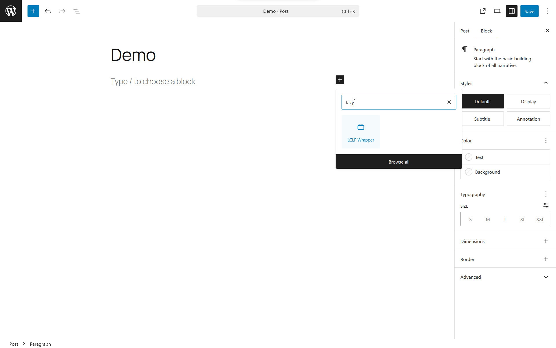 - Dedicated Gutenberg Block: Wrap any combination of Gutenberg blocks (Paragraphs, Lists, Headings, Custom HTML, etc.) with the "LCLF Wrapper" block for easy lazy loading.