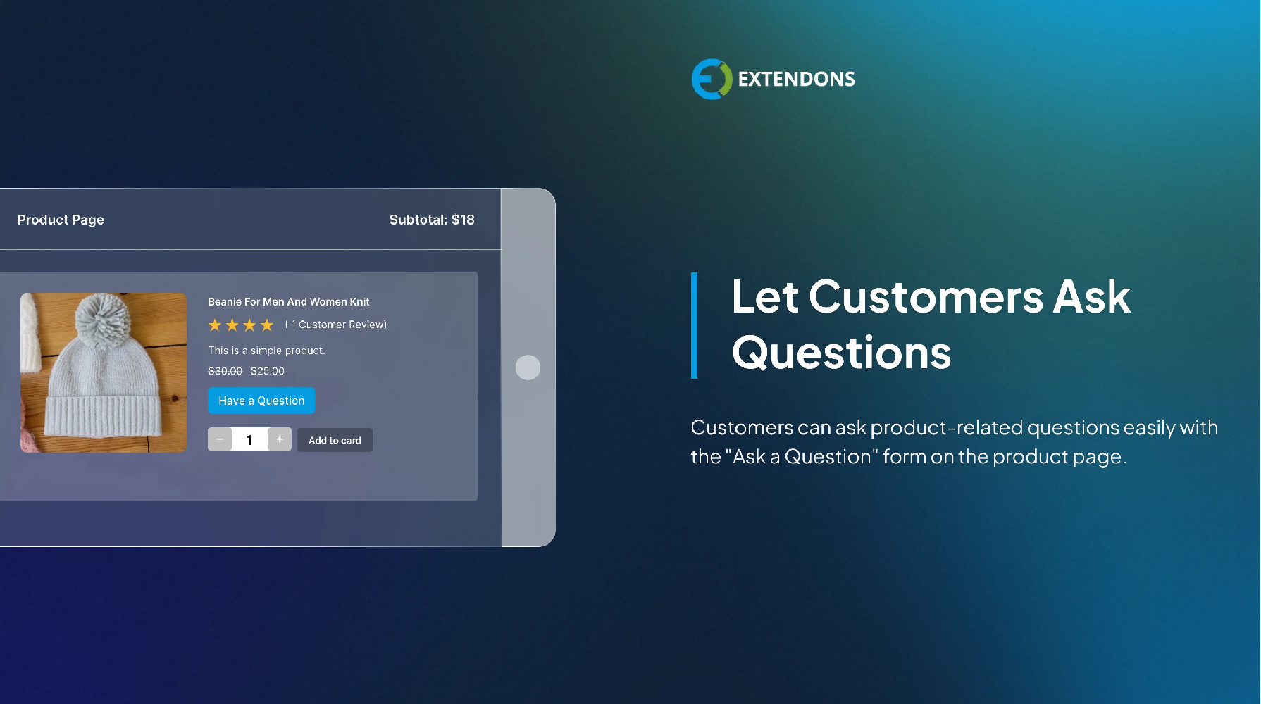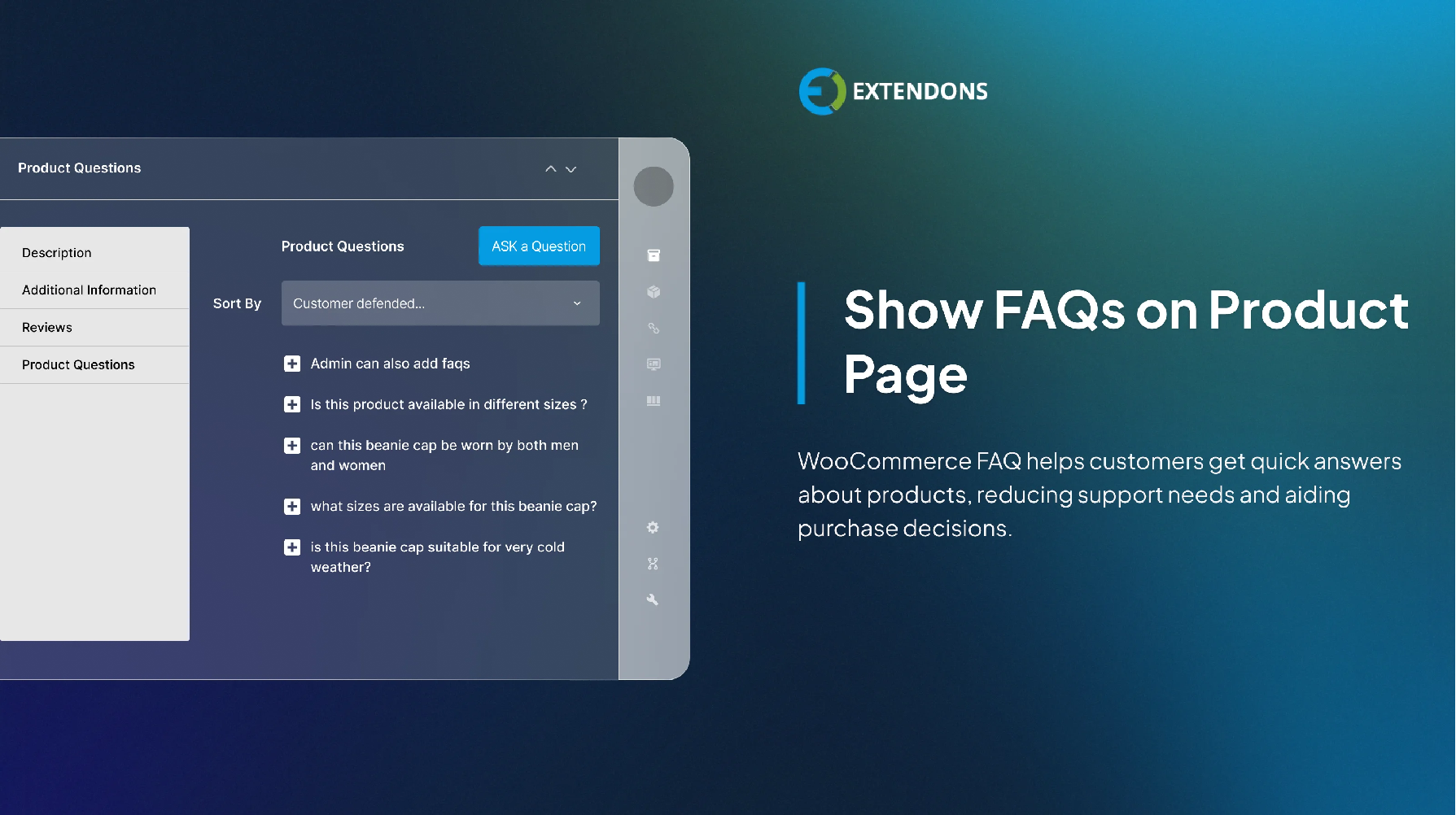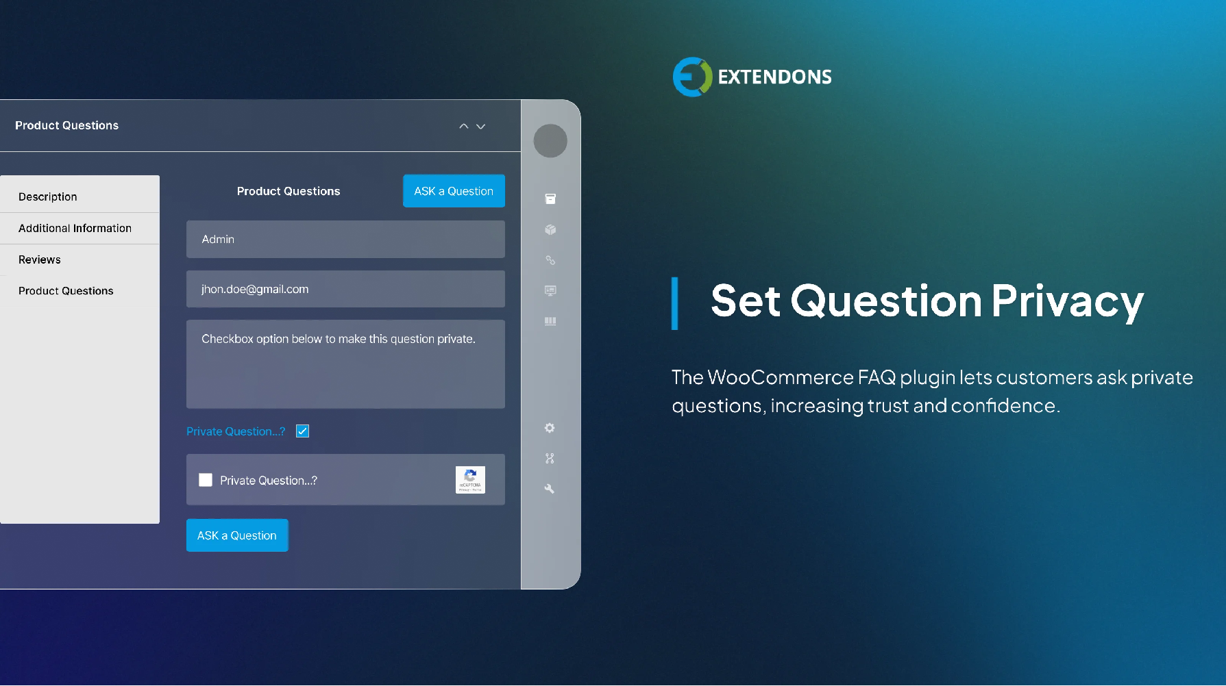 Product FAQs and Questions for WooCommerce by Extendons gives you a way to add FAQs directly on the product page, making it easier for customers to find extra details about items. Shoppers can also use the built-in “Ask a Question” form to submit new queries. As the admin, you get to review, approve, or disapprove each submission, and publish helpful responses that appear publicly for everyone or privately when needed. This not only reduces repetitive queries but also builds trust and improves decision making for your customers, while keeping your support workflow more organised.