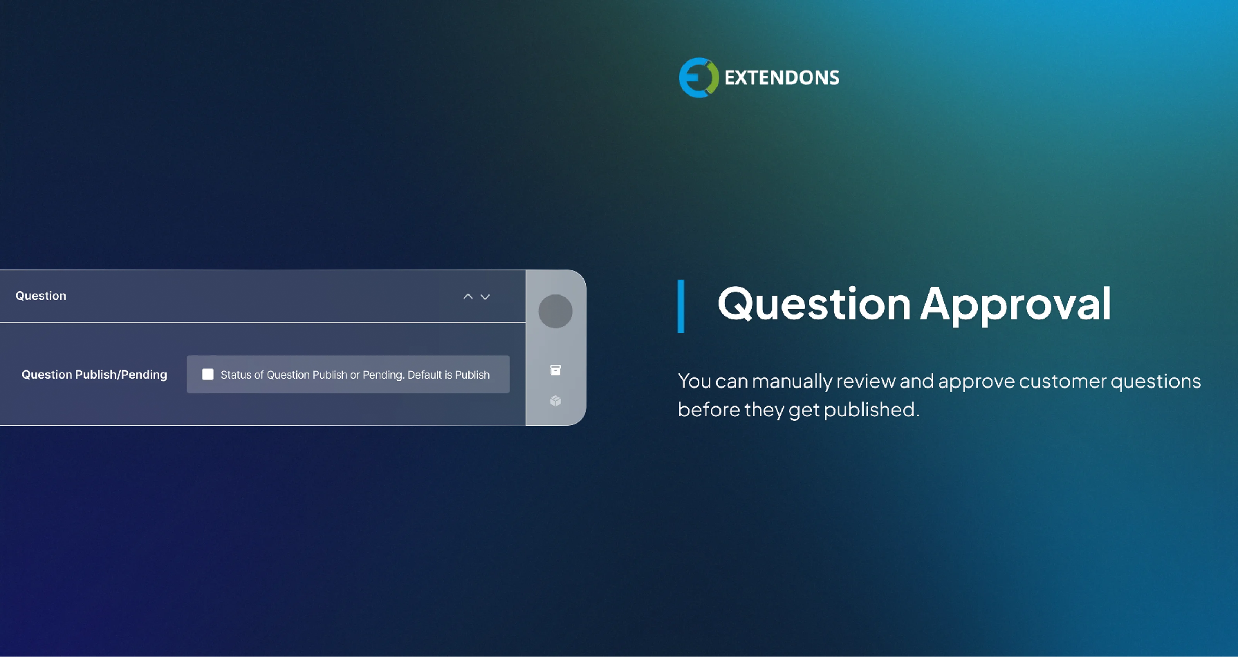 From the admin side, you can decide which customer questions to display. Questions don’t go live automatically, giving you control to review and approve them before publishing.