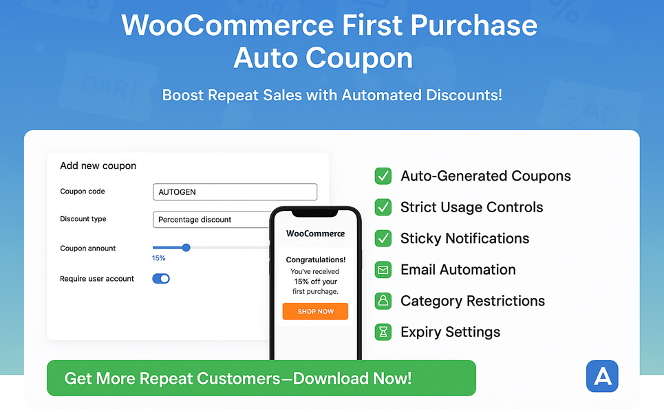 The WooCommerce First Purchase Auto Coupon plugin is a powerful marketing tool designed to increase customer loyalty, boost repeat sales, and maximize revenue by automatically rewarding first-time buyers with exclusive discounts.