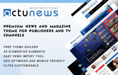 ACTUNEWS is a clean modern rich features Elementor blog magazine and news WordPress theme, comes with a lot of features and is easy to use, it can be used to build any type of website and comes with 4 news and magazine demos, The themes come packed with a lot of elements that can be used with elementor to create any type of website, and to let our clients more happy we have included the Element Pack Pro plugin for free, the theme let you also to create custom pages with the help of built-in theme builder that will help you create unlimited custom headers, footers, sidebars, mega menus... for any page.