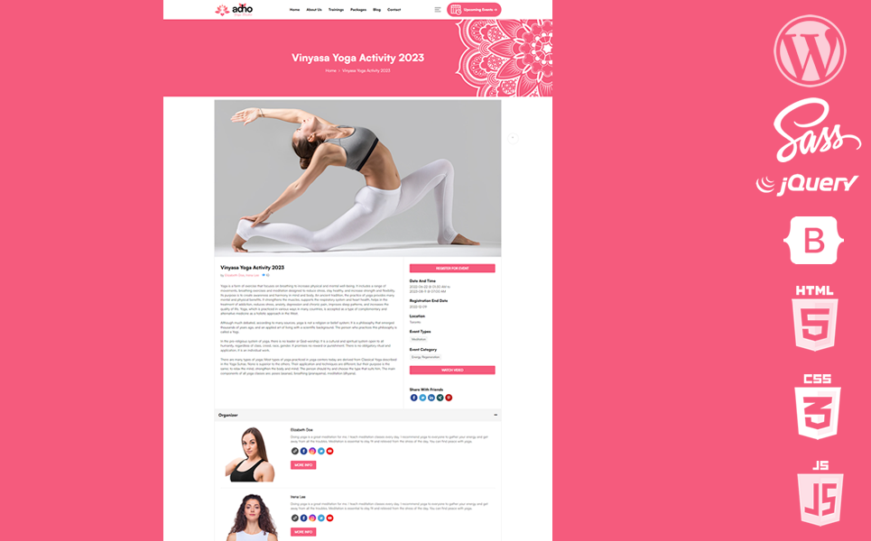 Adho WordPress Theme is quality custom theme made for Yoga, Yoga Classes, Yoga Studio and Meditation.