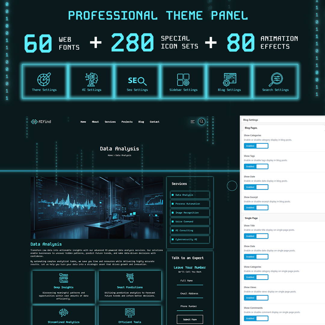 From its futuristic dark theme with neon blue accents (#5ceeff) to its advanced AI-driven features, AIfind is built to help you create an immersive, visually stunning, and highly functional website. The theme offers a fully customizable, modular structure powered by Advanced Custom Fields (ACF), providing an unmatched level of control over your website’s layout, colors, typography, and functionality.