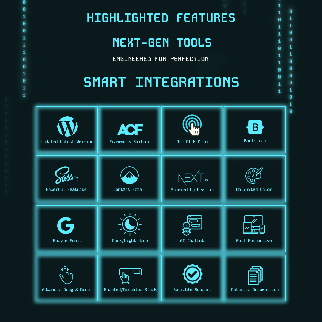 - Matrix Effect: The background constantly refreshes with flowing binary code, simulating the futuristic world of artificial intelligence and tech. This immersive effect draws visitors into your website and enhances the high-tech atmosphere.