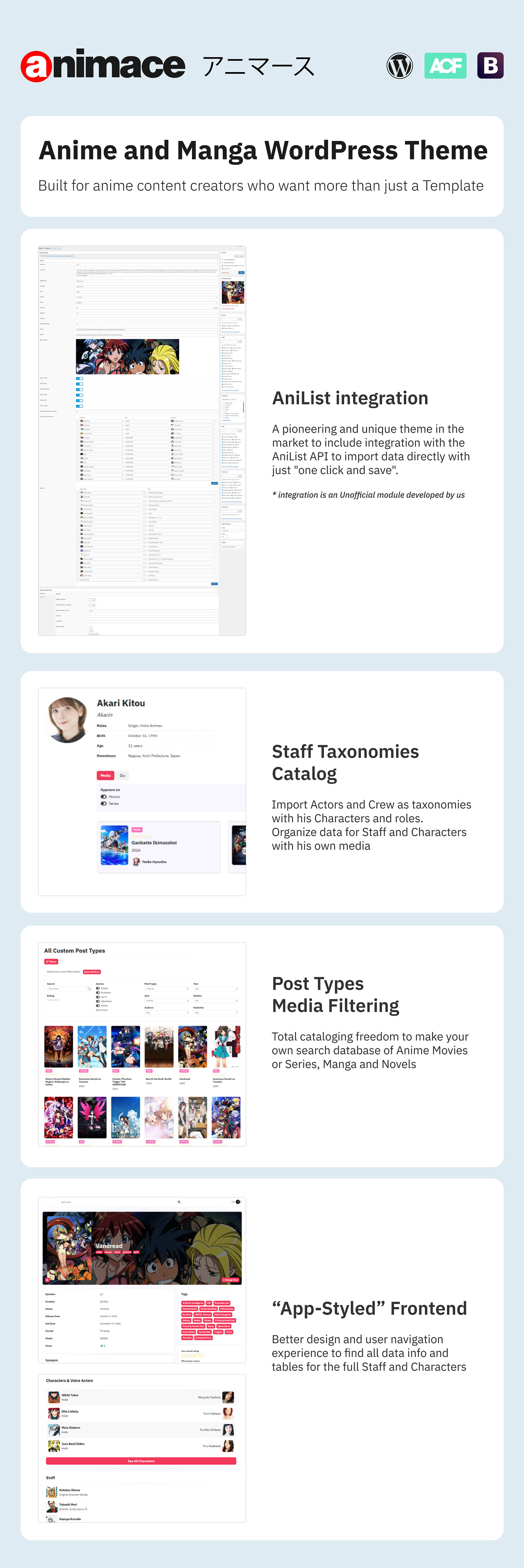 ANIMACE is the unique WordPress theme on worldwide market with optional AniList API support. Just drop a game or series ID, and it auto-imports complete metadata — titles, genres, synopses, release dates, and more. Say goodbye to manual entry and hello to instant, structured content.
