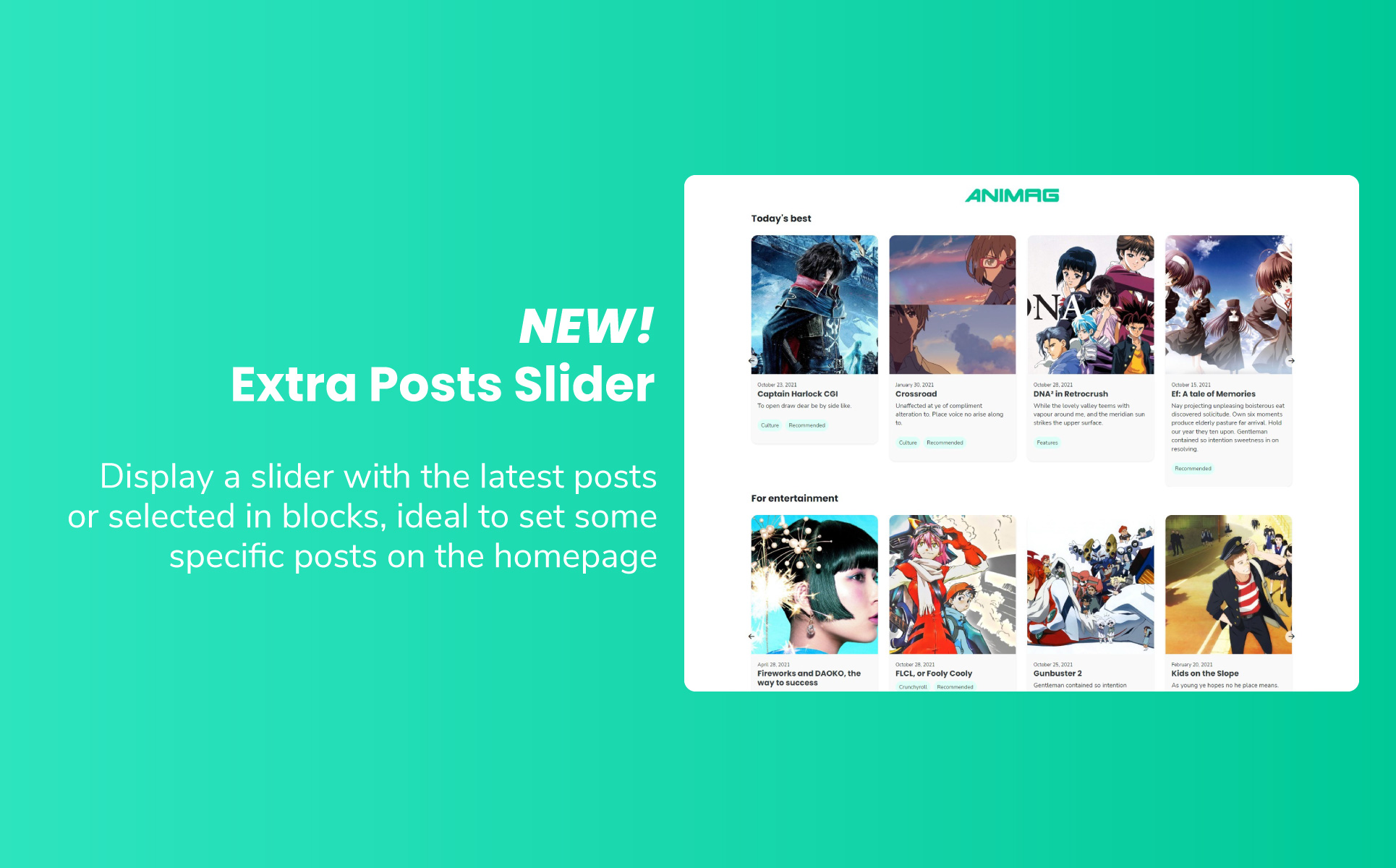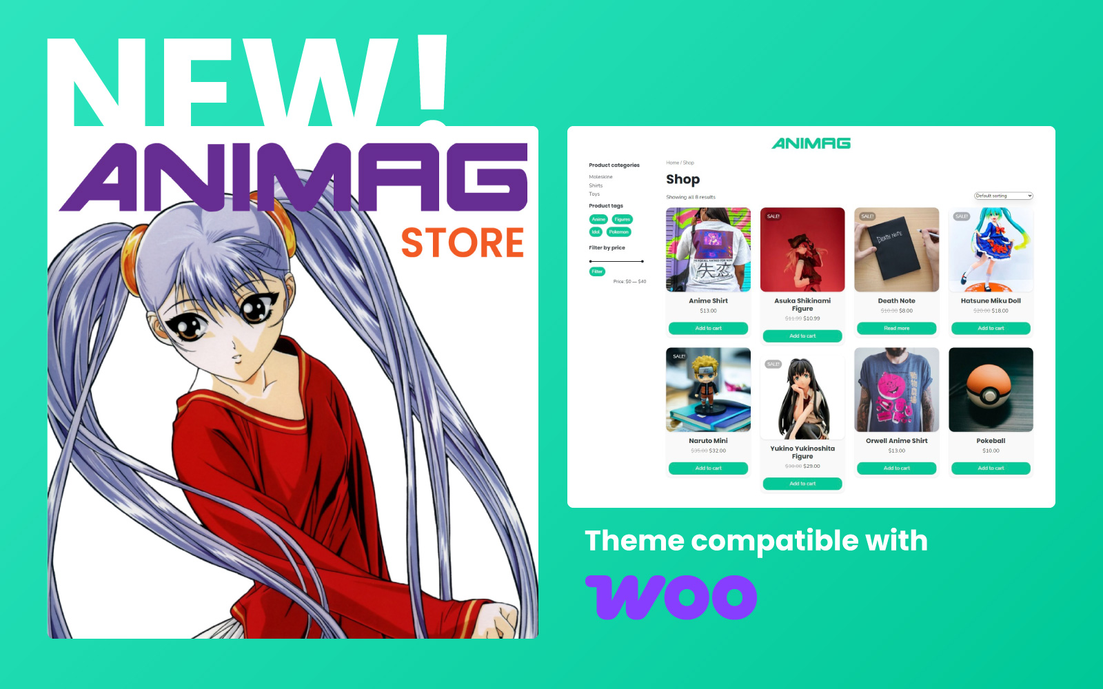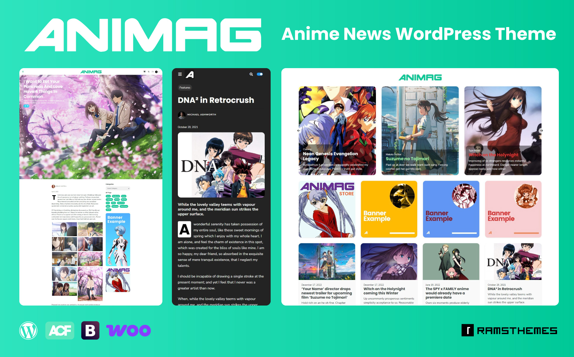 ANIMAG is a new editorial web design creation for Anime News WordPress themes, built with Bootstrap 4 and Advanced Custom Fields (ACF) Pro. It comes with quick options to easy set up the site with custom fields, posts and reviews with scores. Ideal for fans, bloggers or influencers of japanese animation and massive culture (including reviews of movies, series or videogames of all time) who searchs an easy and clean way to make a friendly anime/manga news site. As a new addition, Theme is now compatible with Woocommerce, including the template files to adapt the frontend.