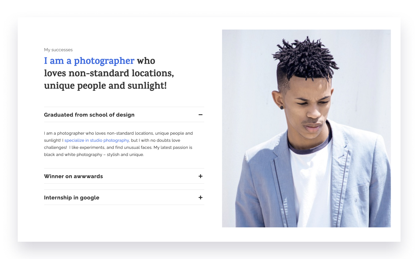 Suitability - Artores is the perfect choice for photographer portfolio templates, personal page templates, designer portfolio templates, web design templates, and design studio templates. Its versatility ensures it seamlessly adapts to your chosen niche, allowing you to make a resounding impact within your industry. Whether you are a freelance photographer, a personal blogger, or a web design agency, Artores is the ideal platform for showcasing your talents and captivating your audience.