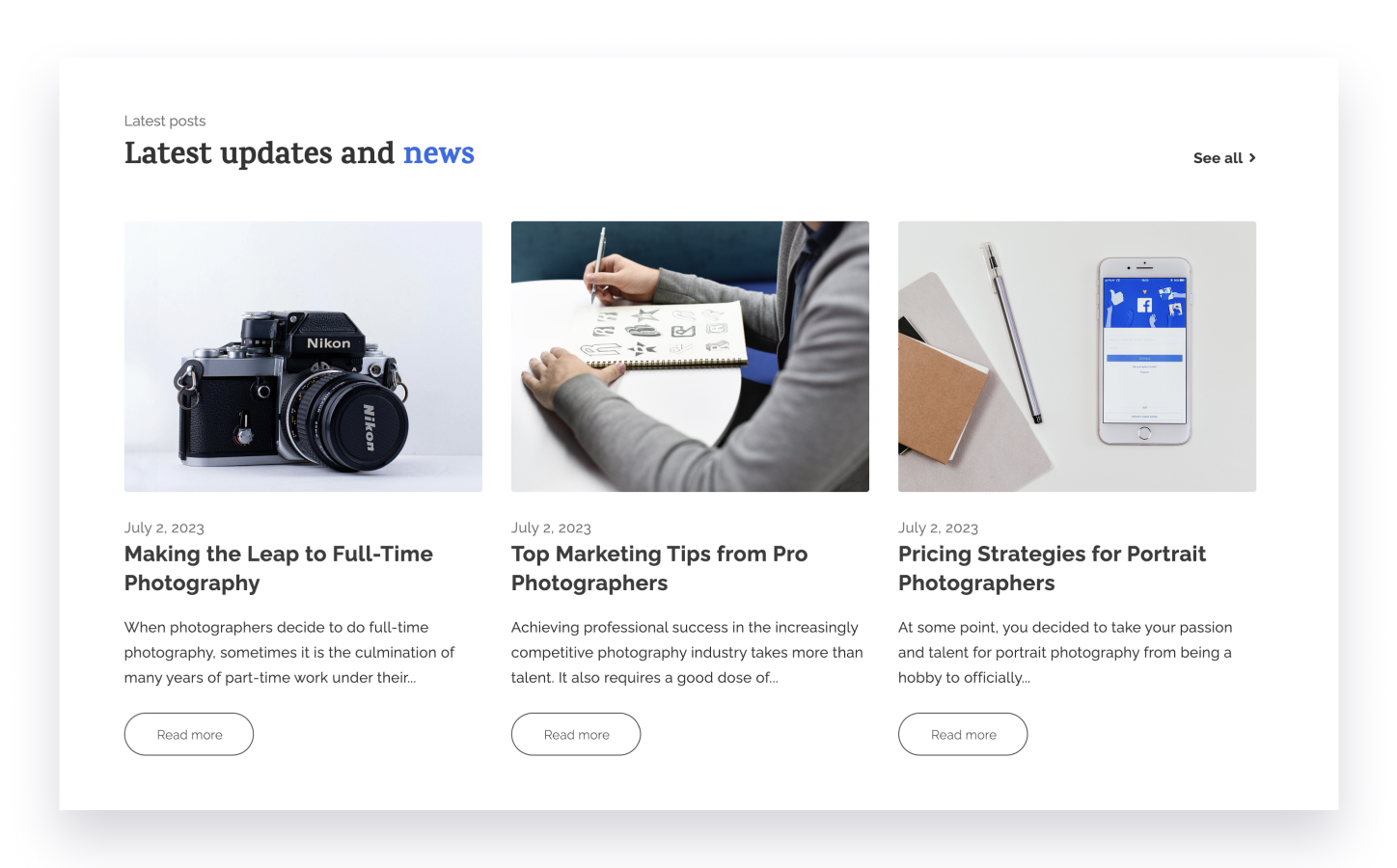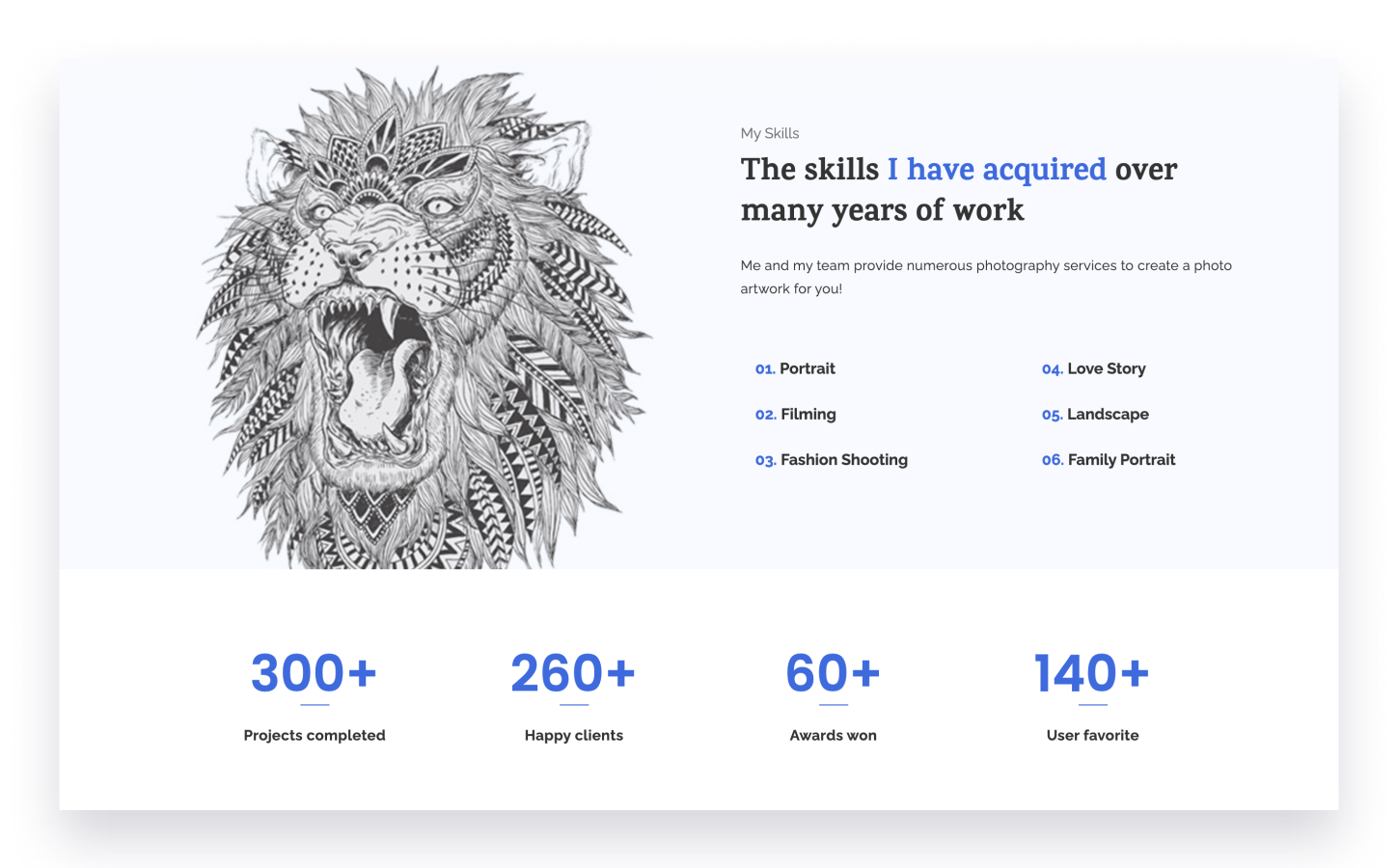 Features - Artores is packed with an impressive suite of features to enhance your website's functionality and provide an exceptional user experience. Showcase your breathtaking photography, impressive design projects, or stunning web designs with a beautiful gallery section, allowing visitors to indulge in your work effortlessly. Create a captivating biography or personal story using the dynamic blog section, enabling you to connect with your audience on a deeper level.