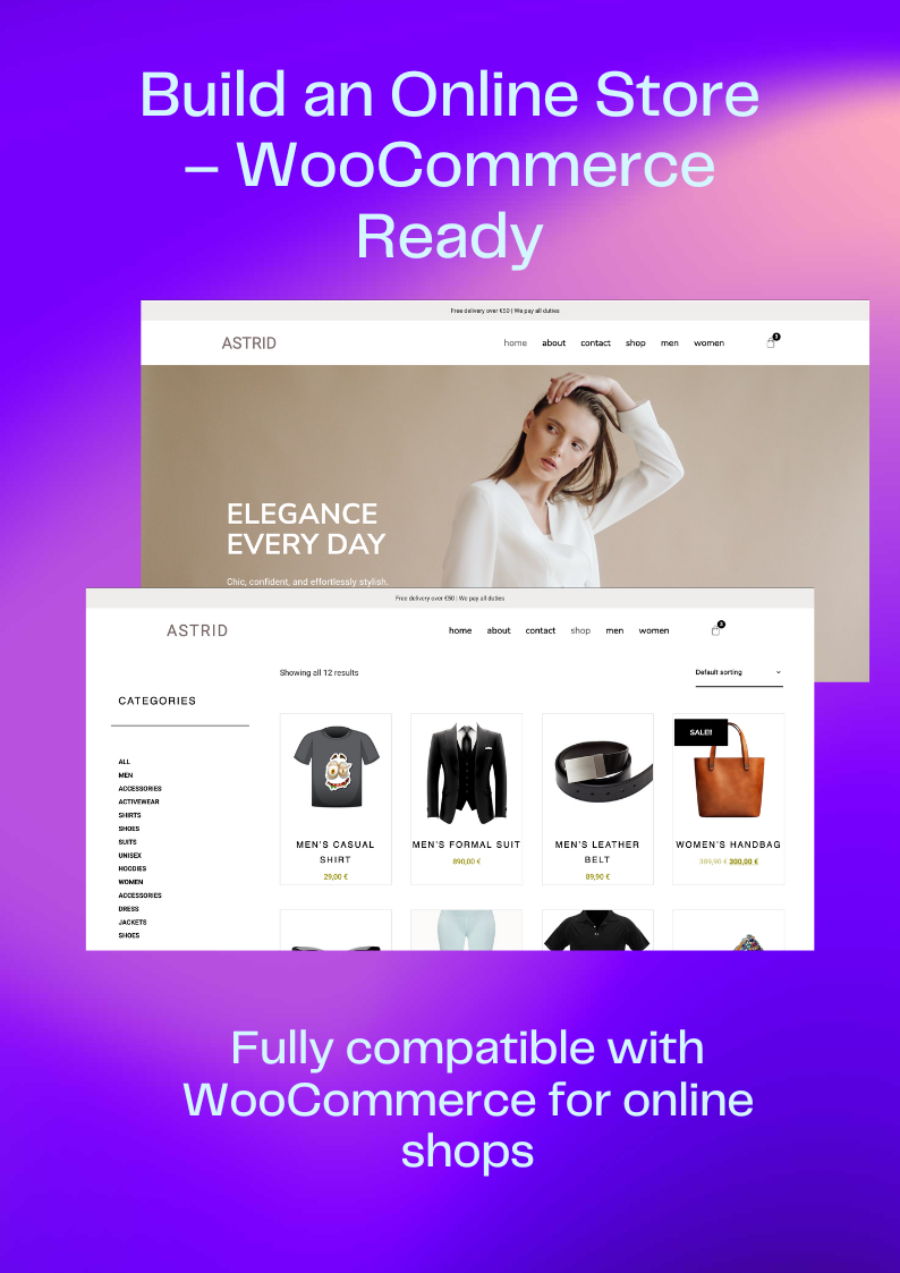 Astrid is a stylish, flexible, and performance-optimized WordPress theme designed for modern businesses, creative agencies, personal portfolios, and fully functional online stores. With seamless WooCommerce integration, beautiful pre-built layouts, and Elementor compatibility, Astrid gives you the freedom to build a website that perfectly fits your brand.