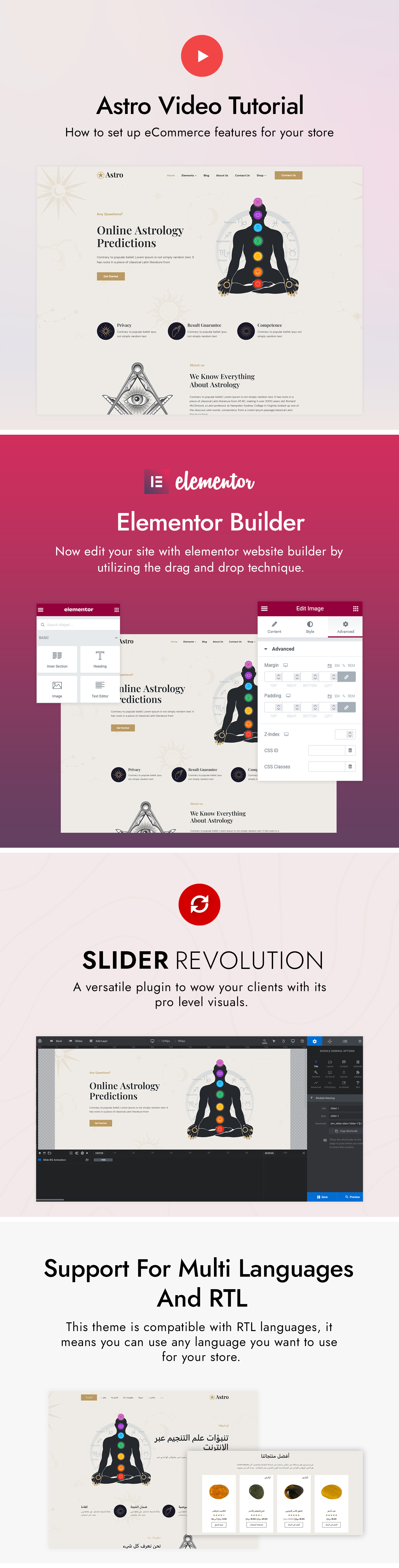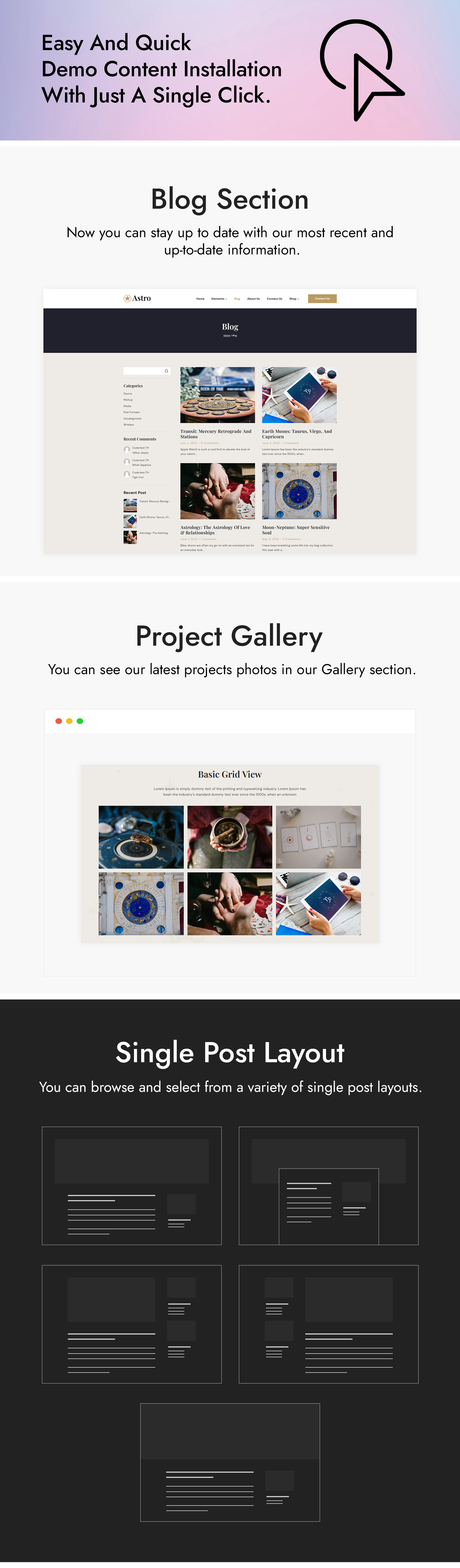 Astrology services including horoscope, gemstone, numerological, cards, birth-date diaries, and vastu-shastra consulting service using Astro theme. Astrology is basis behind "Astro" WordPress template. This can be combined in blogging and a variety of aesthetic options to inform your audience about vastu-shastra, solutions, upcoming challenges, with other service. Astrologists and horoscope specialists may easily create a beautiful website because the Astro theme was created exclusively with them in mind. As a result, they won't encounter any problems or feel as though their website is lacking anything.