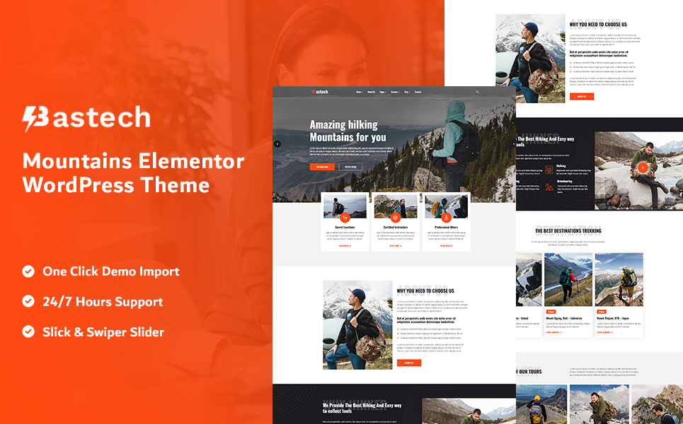 Bastech - Mountains Elementor WordPress Theme is a versatile and visually appealing template designed for mountain-related businesses, outdoor adventure services, or nature-focused organizations. Built with the intuitive Elementor page builder, it offers customizable layouts, responsive design, and various pre-designed sections to showcase services, galleries, and contact information effectively. This theme enables users to create engaging, professional websites with ease, highlighting their mountain or outdoor adventure offerings while ensuring a seamless user experience across devices.