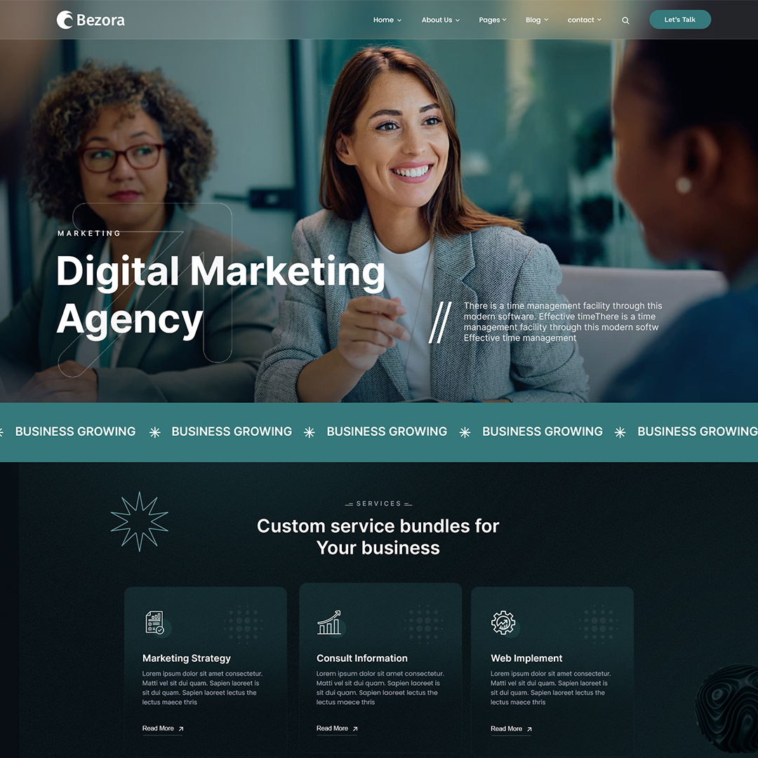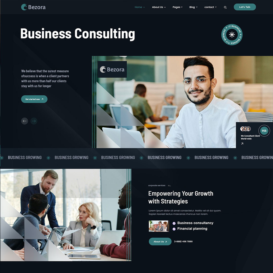 Bezora is a powerful, modern, and highly professional Business Consulting & Digital Marketing Agency WordPress Theme, designed for consulting firms, corporate businesses, marketing agencies, financial advisors, and entrepreneurs who want to build a strong online presence. Built with the Elementor Framework, Bezora provides a seamless drag-and-drop editing experience, making it easy to create and customize your website without any coding skills.