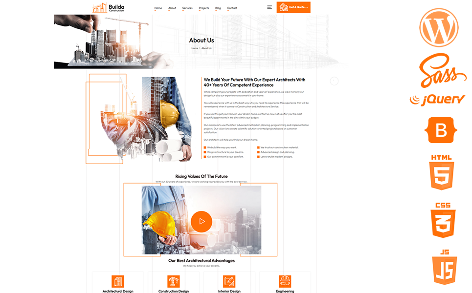 Builda WordPress Theme is a modernize wordpress theme developed with fine lines for Construction, Architecture, Architectural Office, Interior Architect, Exterior Architect, Architectural Services, Construction Services and the Whole Construction Services.