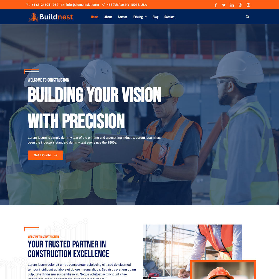 Buildnest is one of the contemporary and professional WordPress themes that have been specifically designed for construction companies, architects, and building contractors. The theme comes with a neat design, fully responsive layouts, and hassle-free customization via Elementor. Buildnest is just a few clicks away from establishing a strong website with a one-click demo import, various homepage designs, and good integration with popular plugins such as and Contact Form 7. Display your services, works, and team with elegant layouts and quick loading time that attract more clients to your business through the web.
