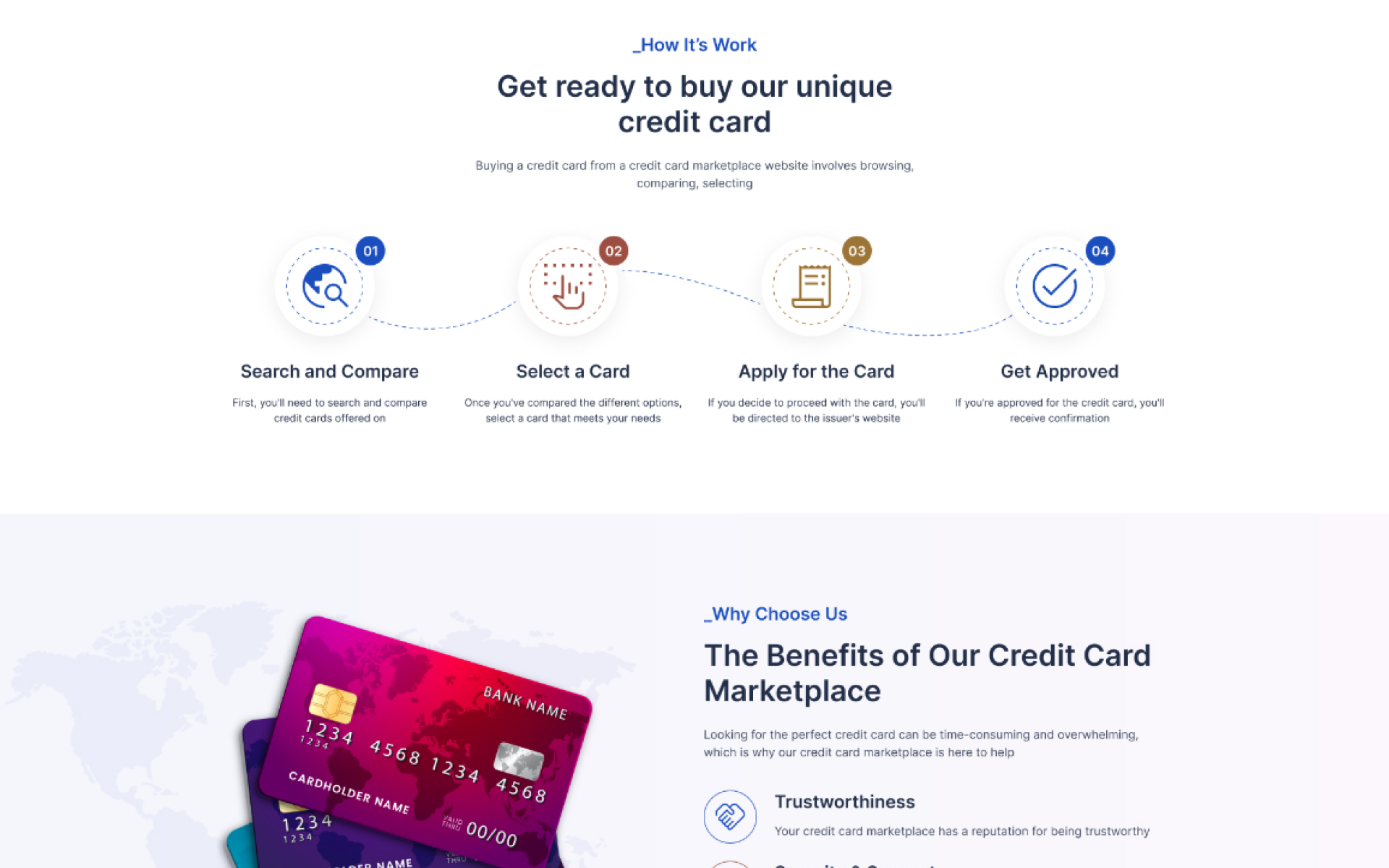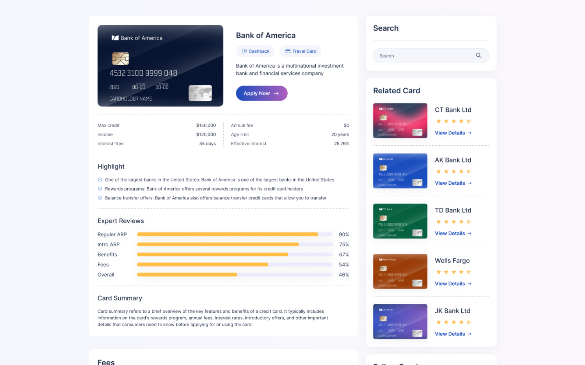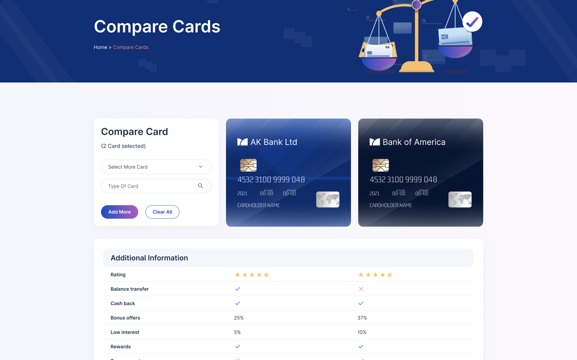 - Card Comparison System – Let users compare features, interest rates, rewards, and offers