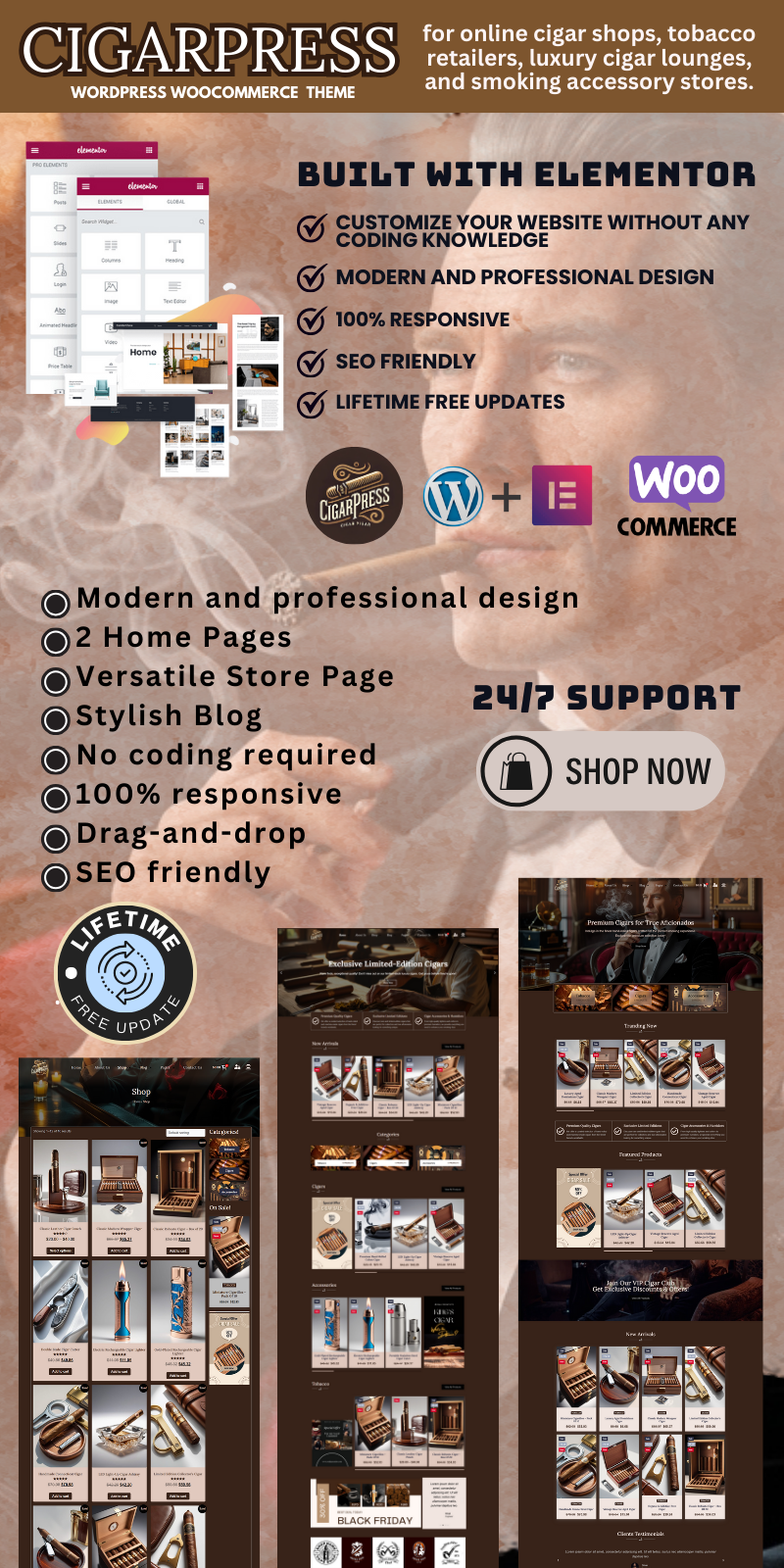 Introducing CigarPress, the ultimate WordPress WooCommerce Elementor theme designed for online cigar shops, tobacco retailers, and luxury smoking lounges. Whether you sell premium cigars, handcrafted tobacco blends, or smoking accessories, CigarPress offers everything you need to create a sophisticated and user-friendly online store.