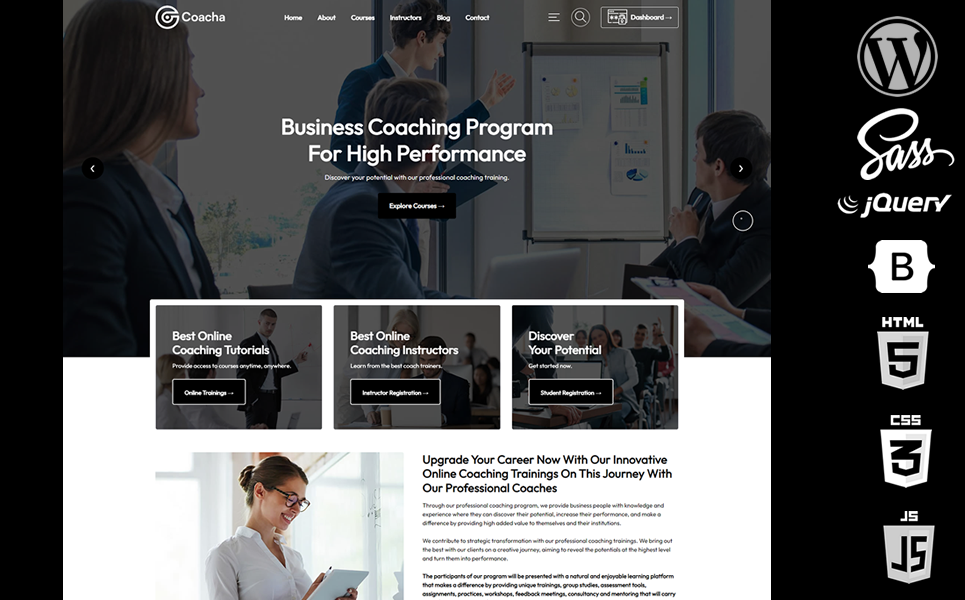 Coacha has powerful features made entirely for professionals. It offers a clear and striking slider screen to visitors entering your site and offers a great educational site with modern registration buttons and special blocks.