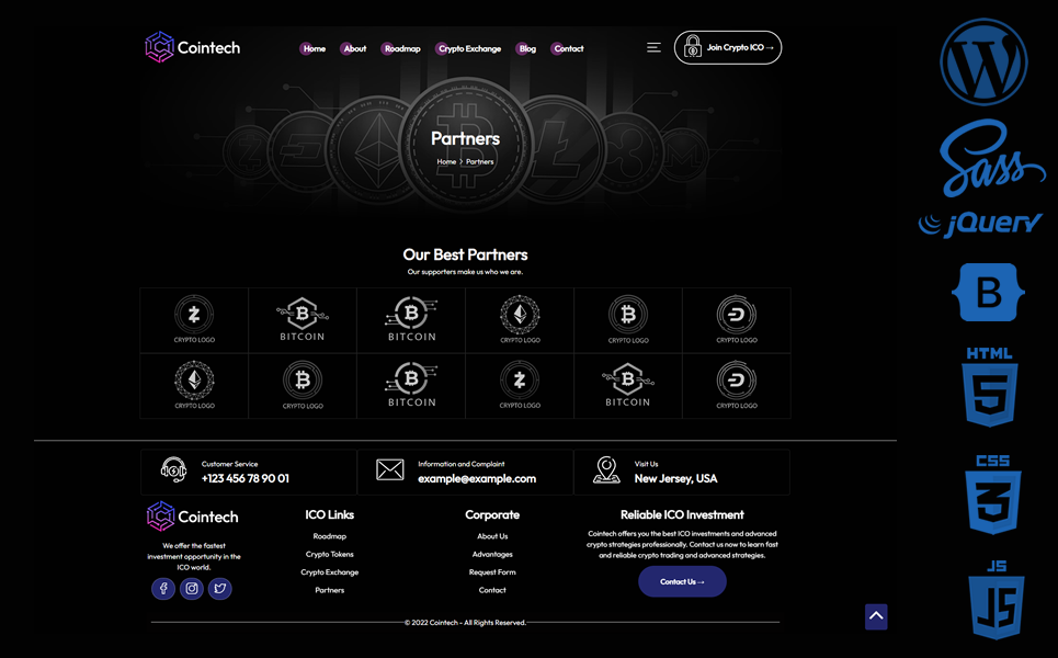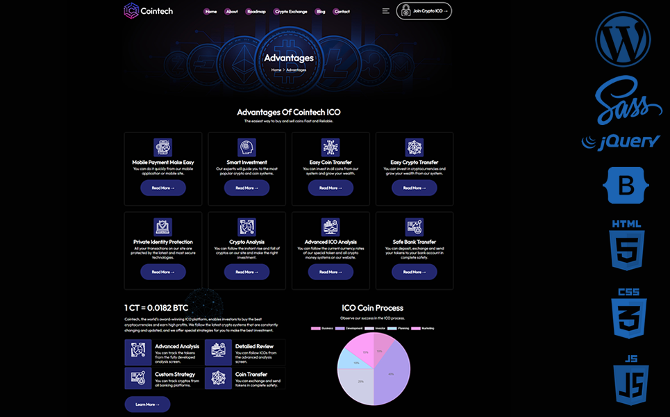 Cointech is equipped with advanced sliders, countdown areas, animated icon sets, popup video areas, charts, pies and many more advanced features.