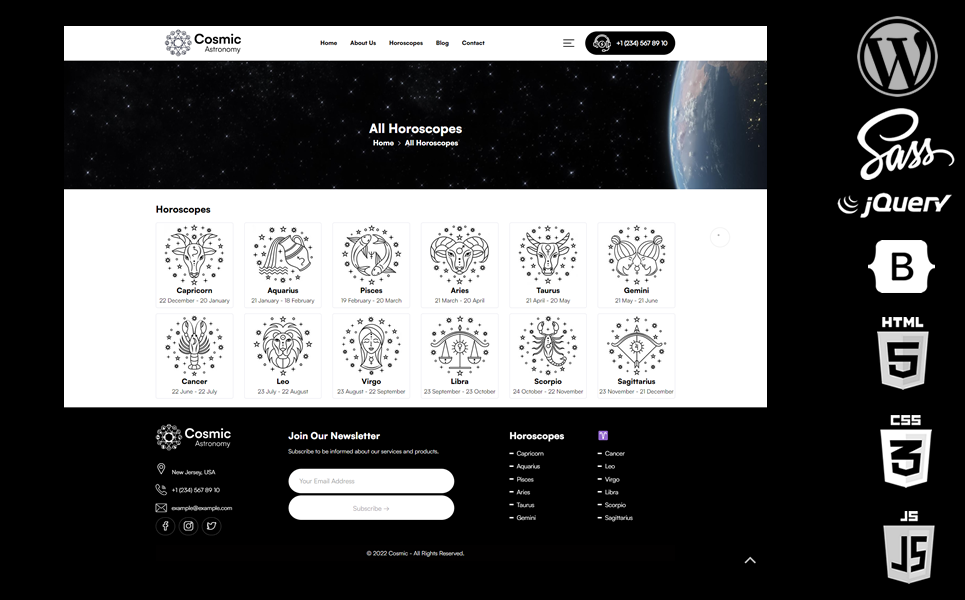 Cosmic WordPress Theme is a professional wordpress theme for Horoscope, Horoscope Reviewers, Zodiac Site, Astronomy, Space, Universe and All Astronomy Branches.