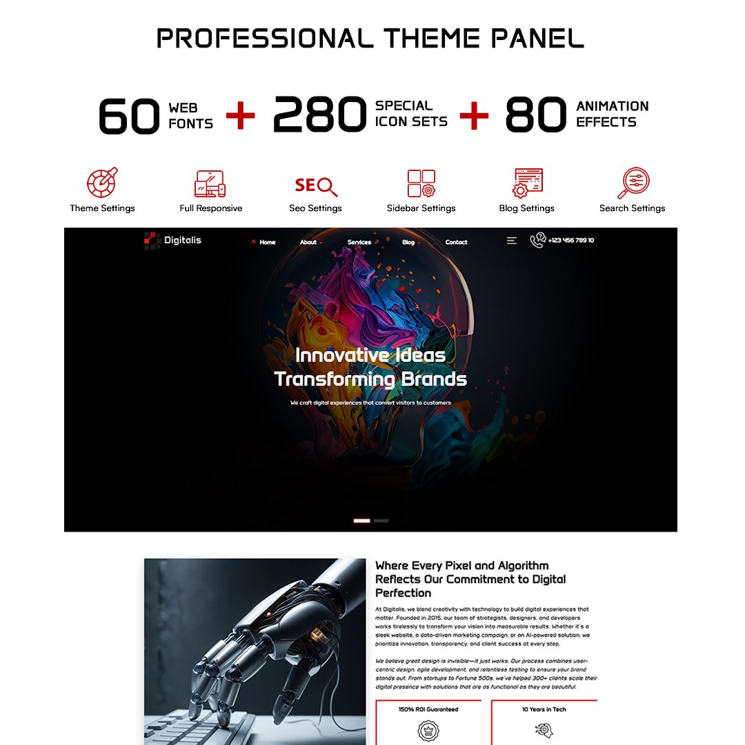 From the homepage to the smallest sidebar element, every detail in Digitalis is built for speed, precision, and visual impact. It’s mobile-first, Core Web Vitals optimized, and lightweight—ensuring your site not only looks good but also performs exceptionally well on all modern devices.