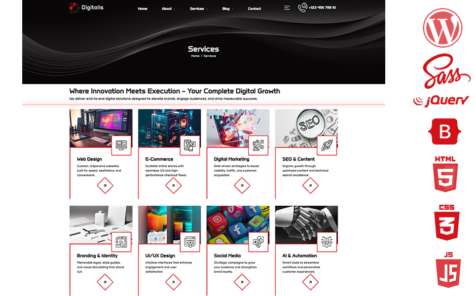 Powered by ACF (Advanced Custom Fields), Digitalis offers complete control over your content and layout. You can tailor every section to match your brand identity—effortlessly managing dynamic content blocks from your WordPress dashboard. Built with Sass (SCSS), the theme is optimized for modular styling, fast performance, and developer-friendly customization.