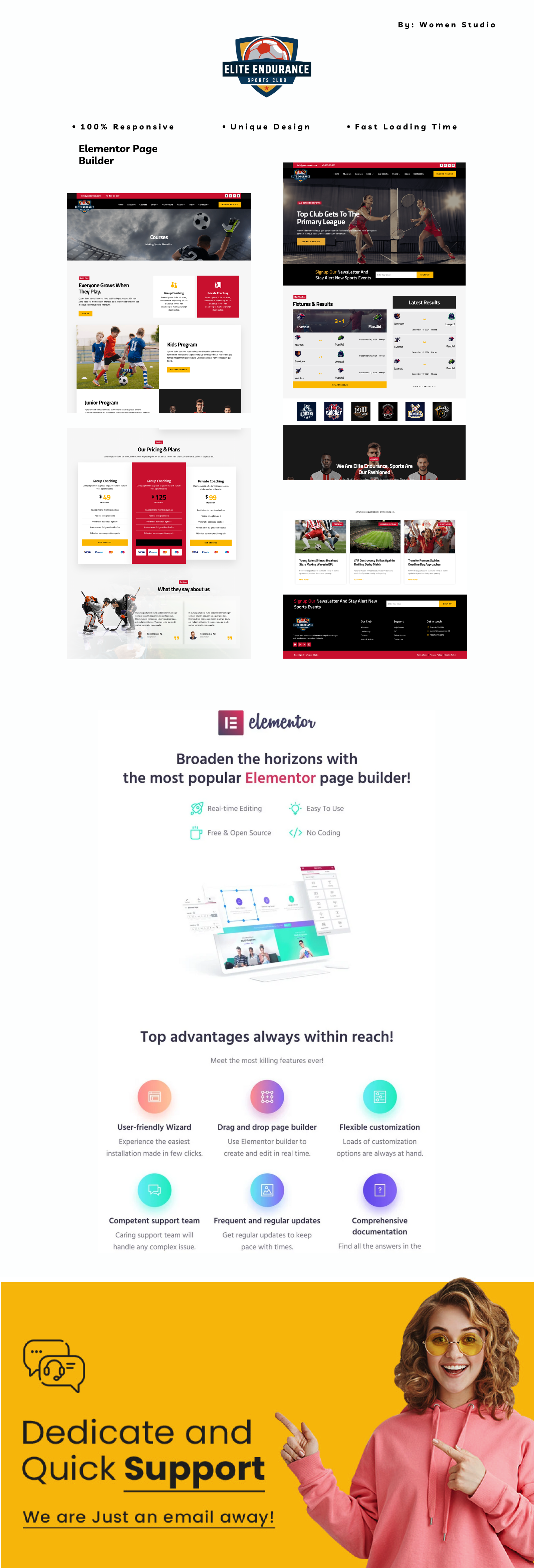 Elite Endurance is a versatile WordPress theme tailored for sports coaching and sports shop websites, leveraging the power of the Elementor page builder for seamless customization. With its sleek and modern design, Elite Endurance ensures that sports coaches and retailers can effortlessly create a dynamic and engaging online presence. The theme is optimized for speed and performance, providing users a smooth browsing experience across devices. It includes a variety of pre-designed templates and layouts, making it easy to highlight coaching services, showcase products, and share success stories with an active community.