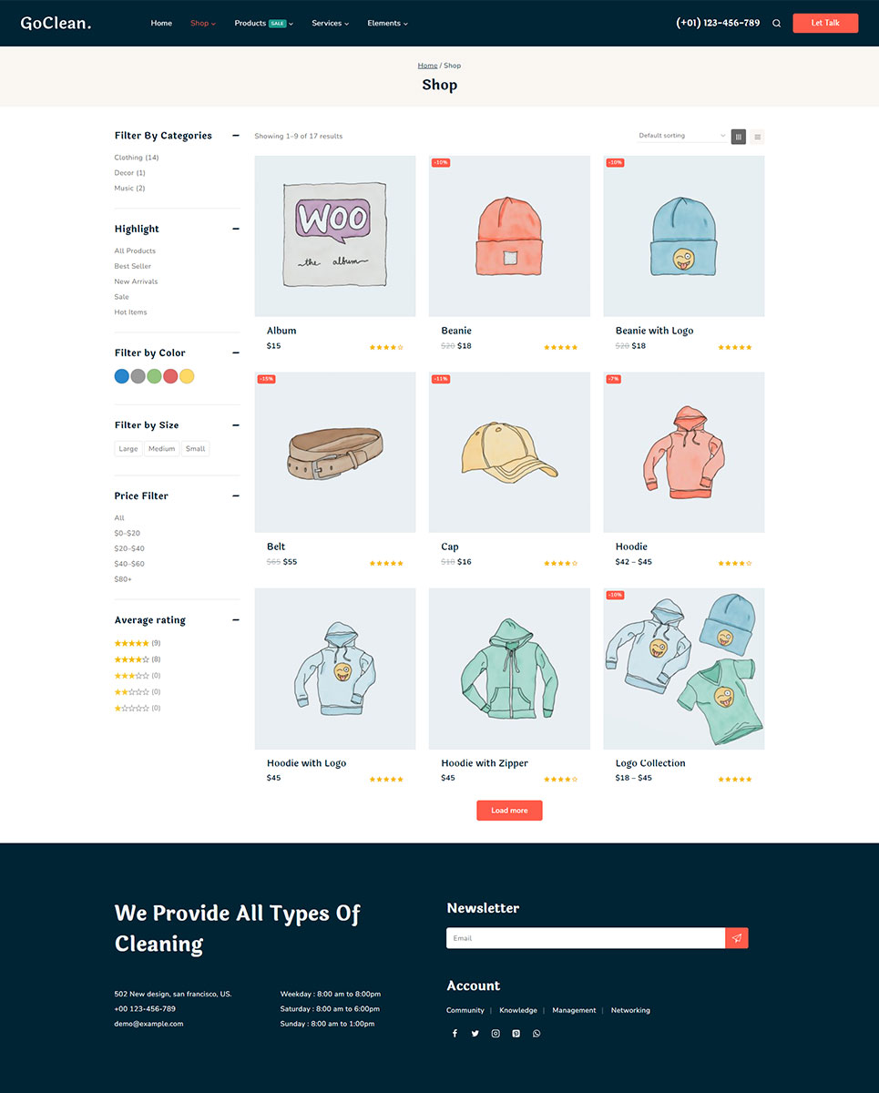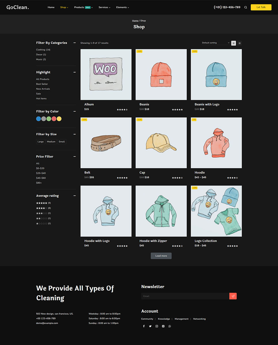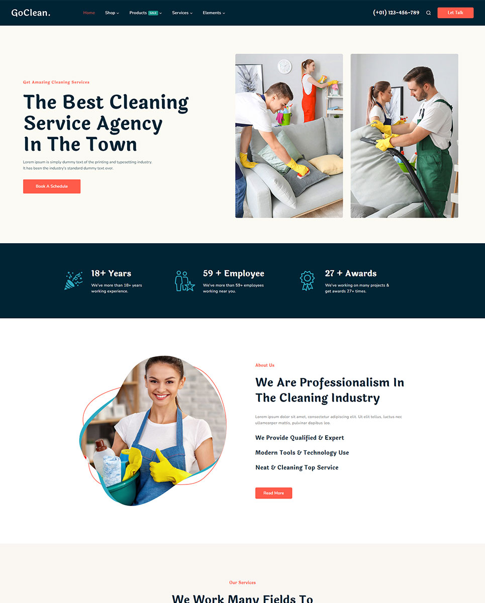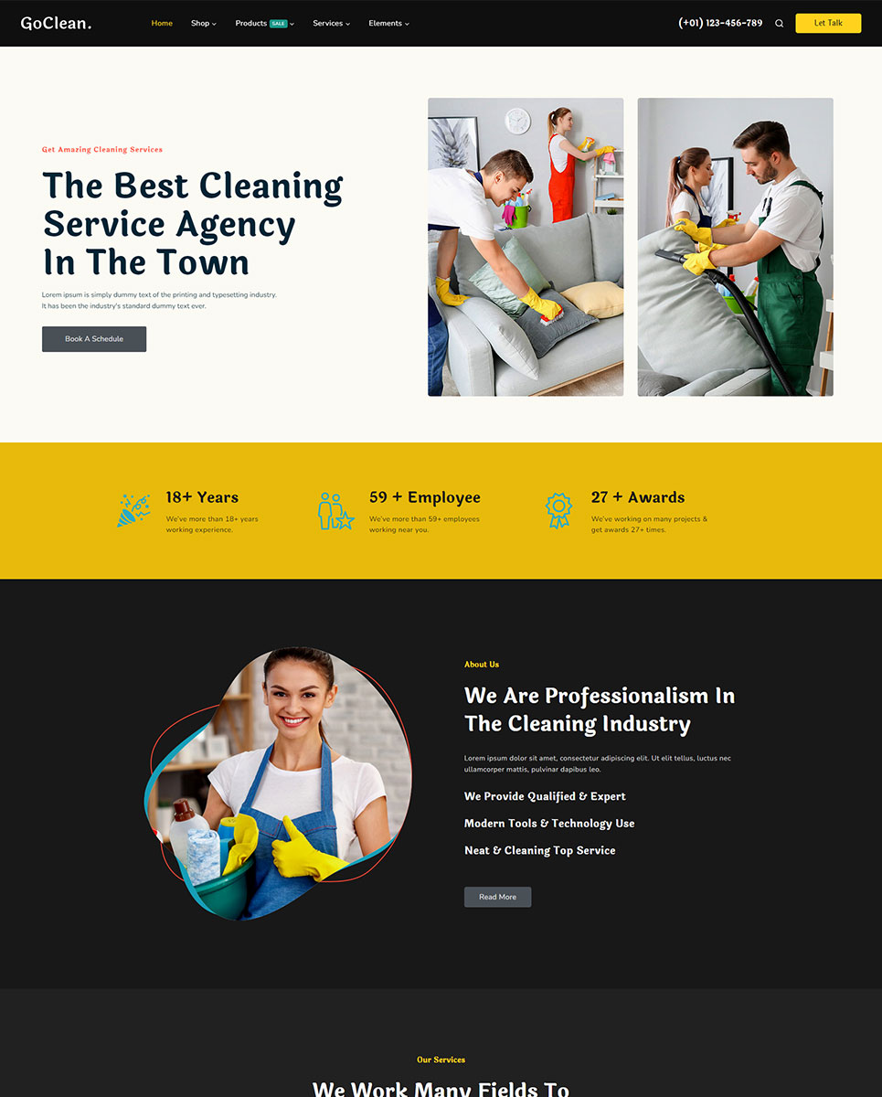 Laundry, dry cleaning, and general cleaning are all services provided by GoClean. A website for a cleaning service business may be made using a responsive WordPress theme built with the Elementor page builder. Additionally, it has a Woocommerce store where users may purchase anything online.