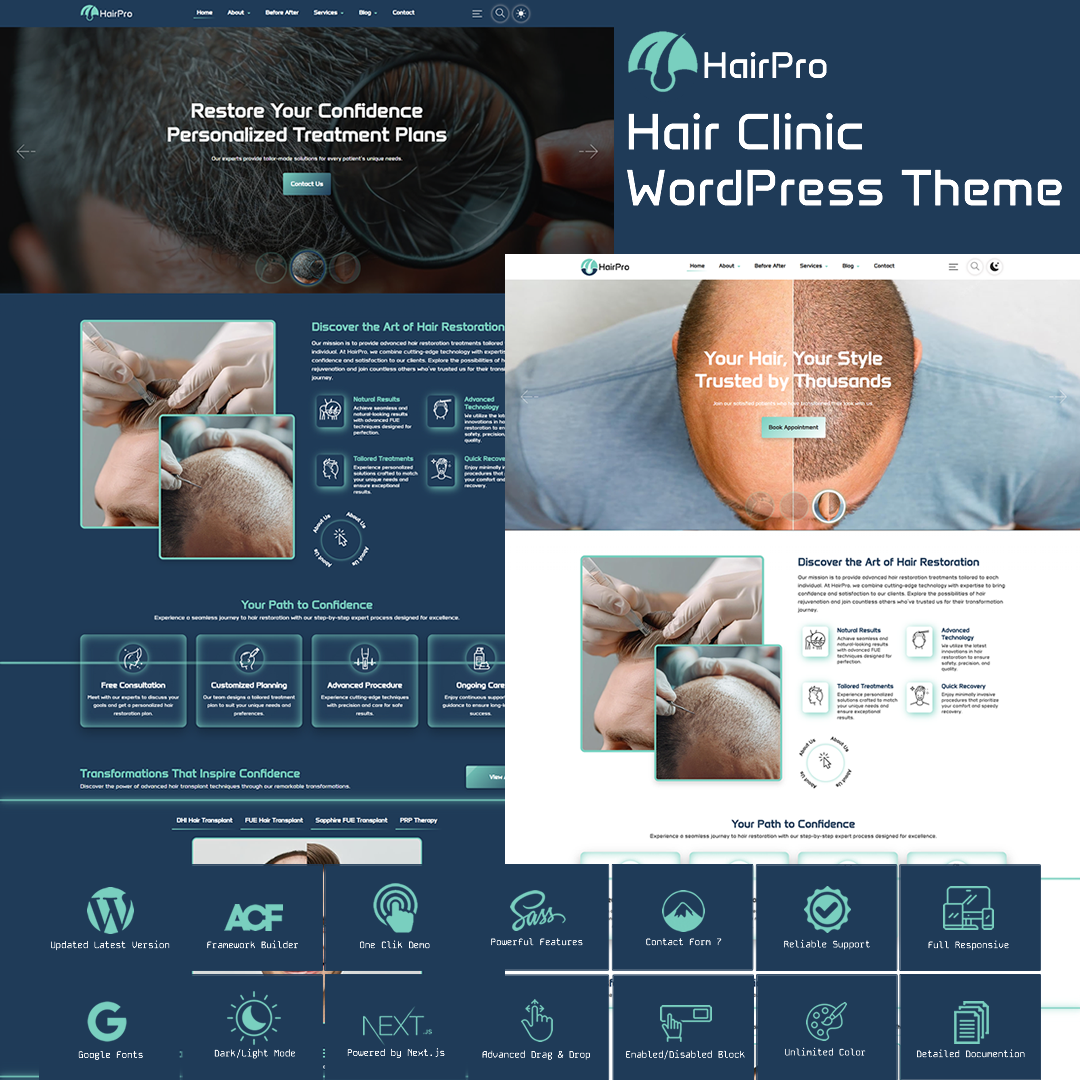 With its modern and patient-centric design, HairPro delivers a fully responsive and user-friendly experience on all devices. Powered by Advanced Custom Fields (ACF), this theme provides complete control over layouts, colors, fonts, and features. Its combination of professional design and advanced customization capabilities makes HairPro the ultimate tool for promoting hair restoration services.